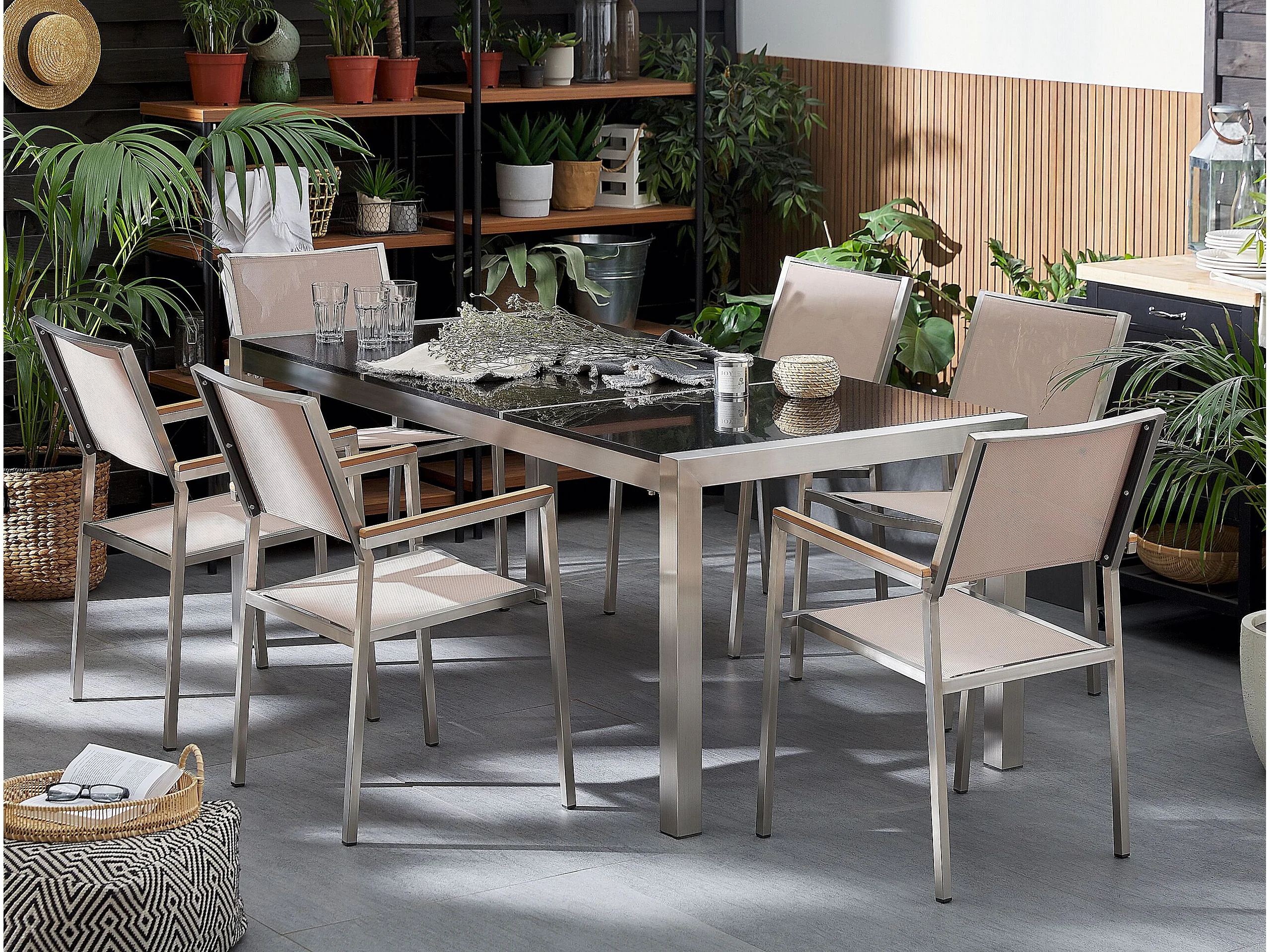 Salle à manger de jardin 6 places GROSSETO Triple plaque Granit Poli Noir/beige