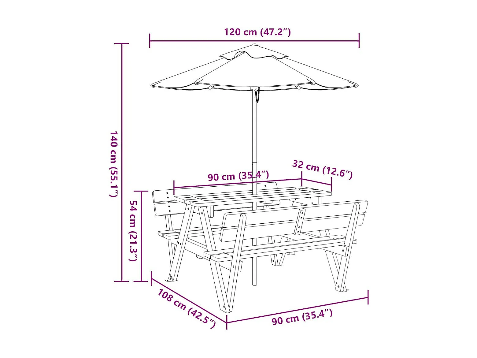 Table de pique-nique pour 4 enfants avec parasol bois de sapin