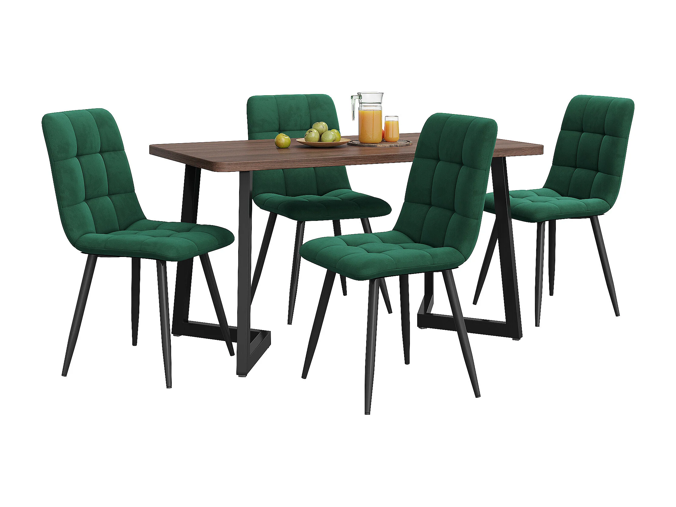Table de Salle à Manger Moderne (5 pièces), avec 4 Chaises en Velours Vert Foncé, MDF en Noyer, Pieds en Métal Noir, (117x68x75 cm)