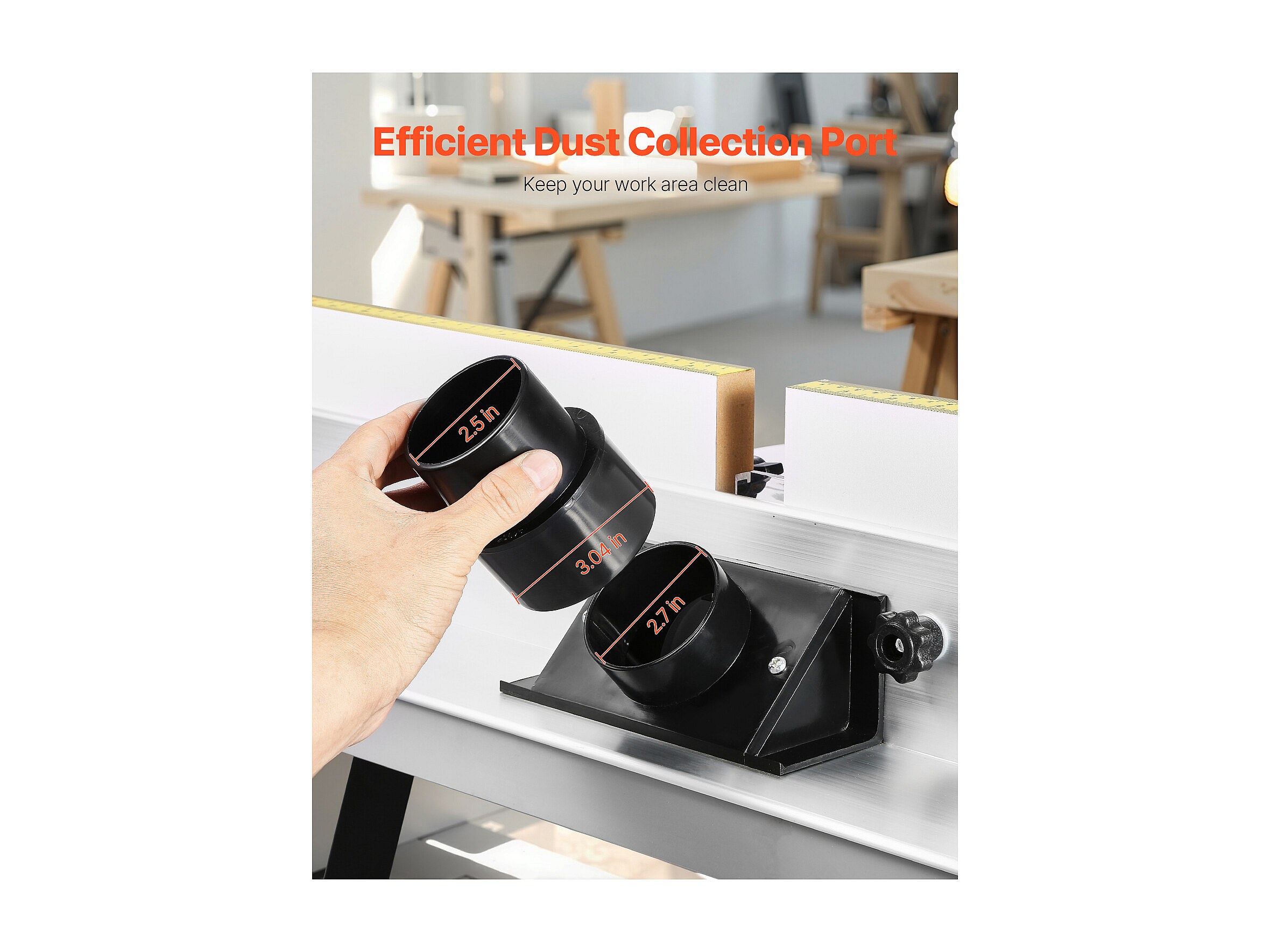 Équipé d'une protection transparente et d'un orifice de récupération de la poussière, le nettoyage devient un jeu d'enfant. La protection transparente bloque les débris volants, tandis que l'orifice de récupération de la poussière, une fois connecté à un tuyau, aspire efficacement la sciure, gardant votre espace de travail propre et bien rangé..