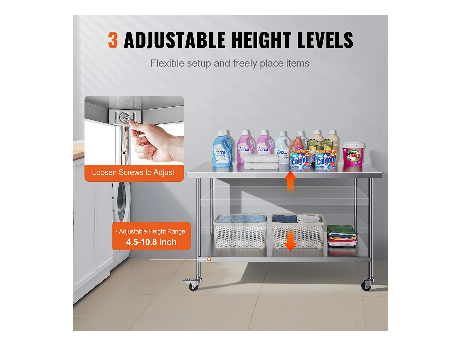 Table de Travail Cuisine SucceBuy, Table de Travail en Acier Inoxydable, 60.96 x 30.48 cm, 4 Roulettes, 3 Niveaux de Hauteur Réglables