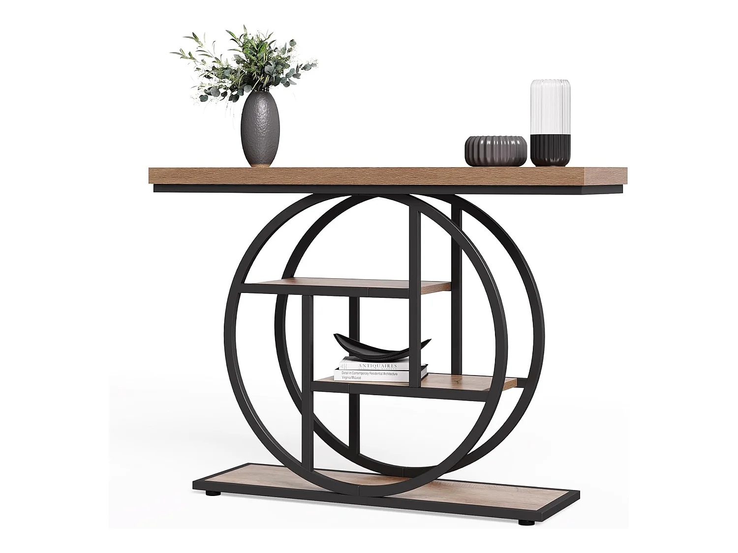 Table console industrielle à 4 niveaux avec base circulaire, tables d'appoint étroites en bois avec étagères de rangement pour salon