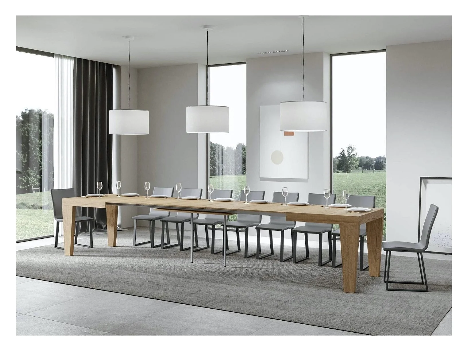 Table rectangulaire extensible 8 à 20 places L 180 à 440cm chêne clair et pieds métal anthracite Flavio