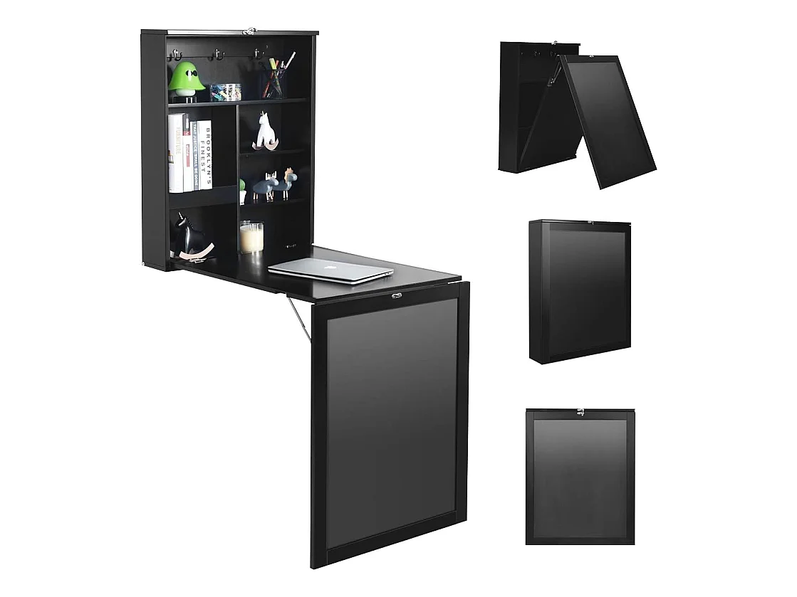 table murale rabattable bureau avec tableau noir, etagère intégrée 75 x 15,8 x 60,1cm