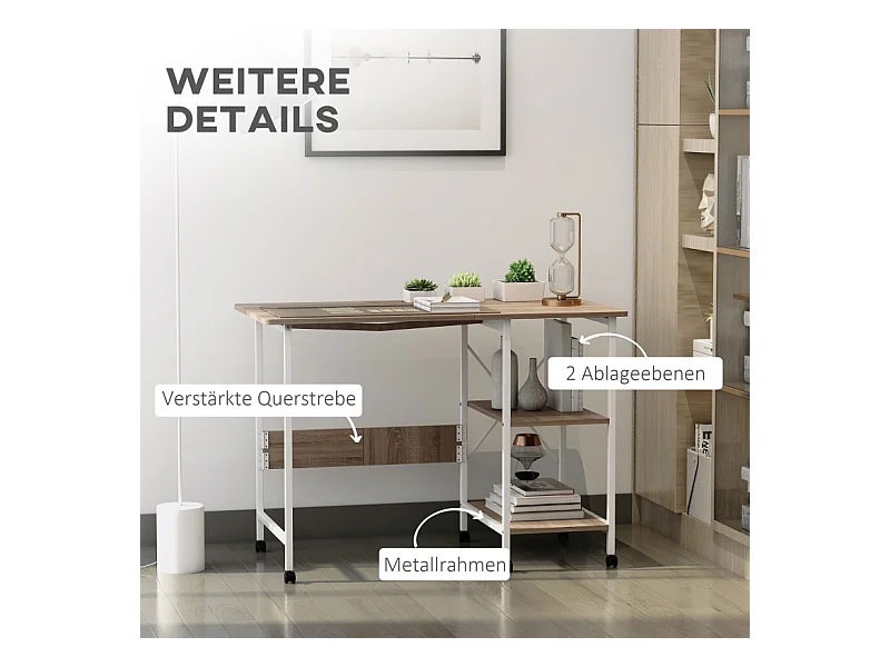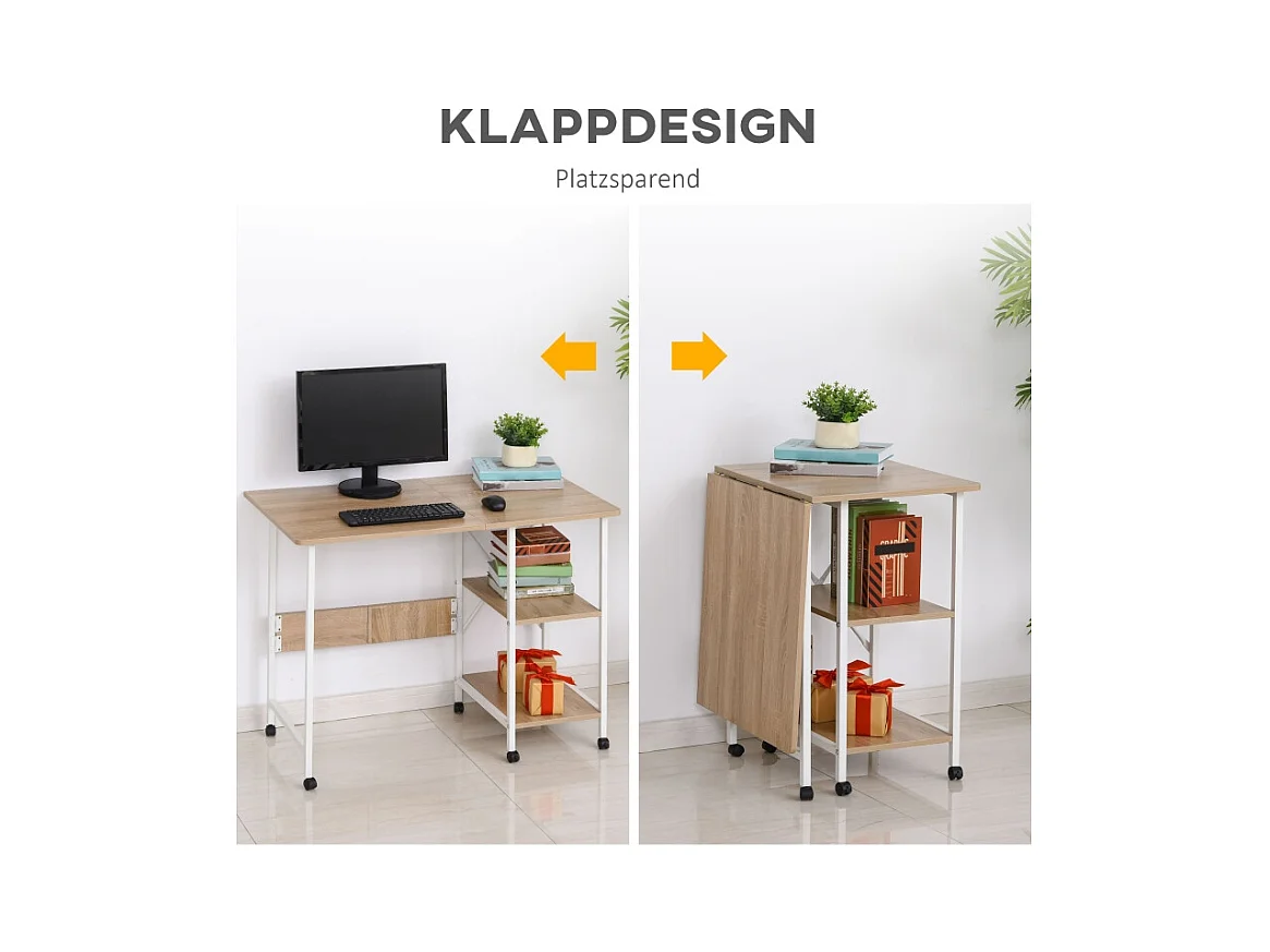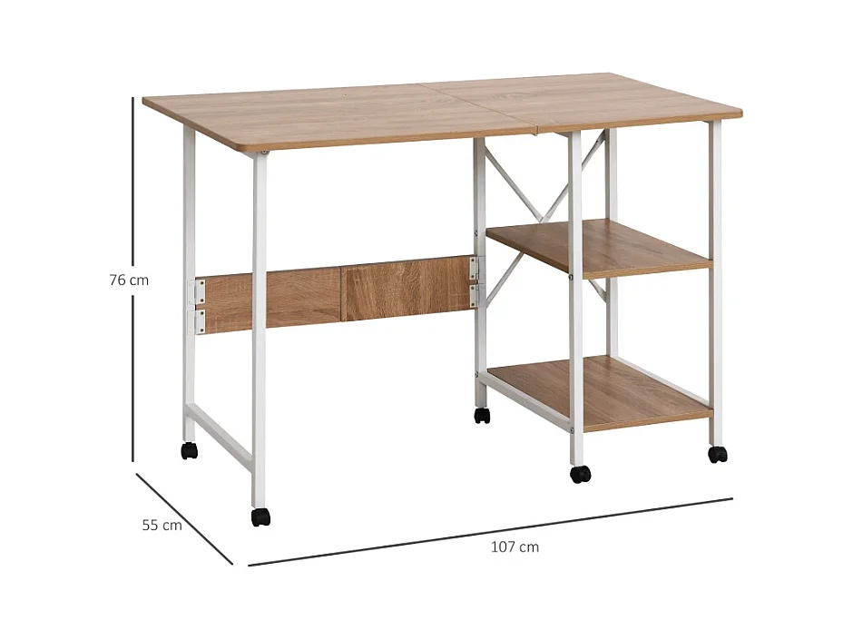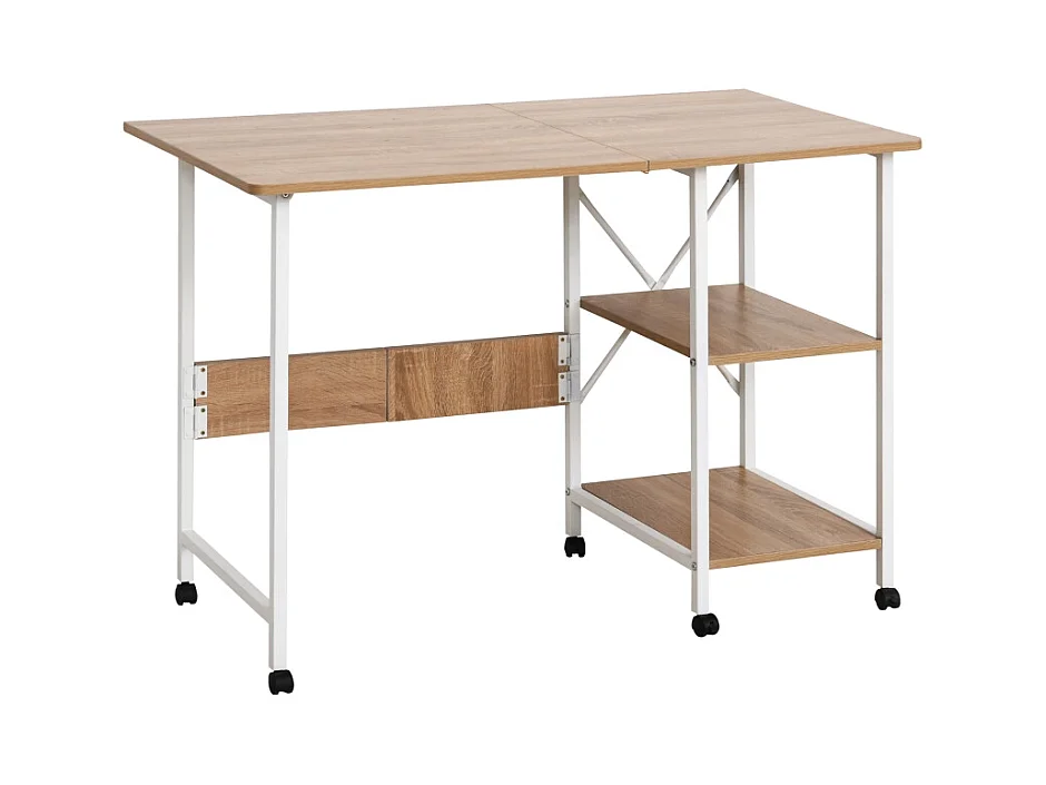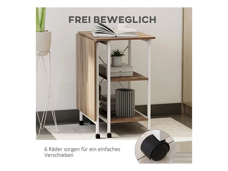 Table pliante mobile, avec étagère, MDF, naturel, 107x55x76 cm, avec roulettes, pour bureau et espace de travail