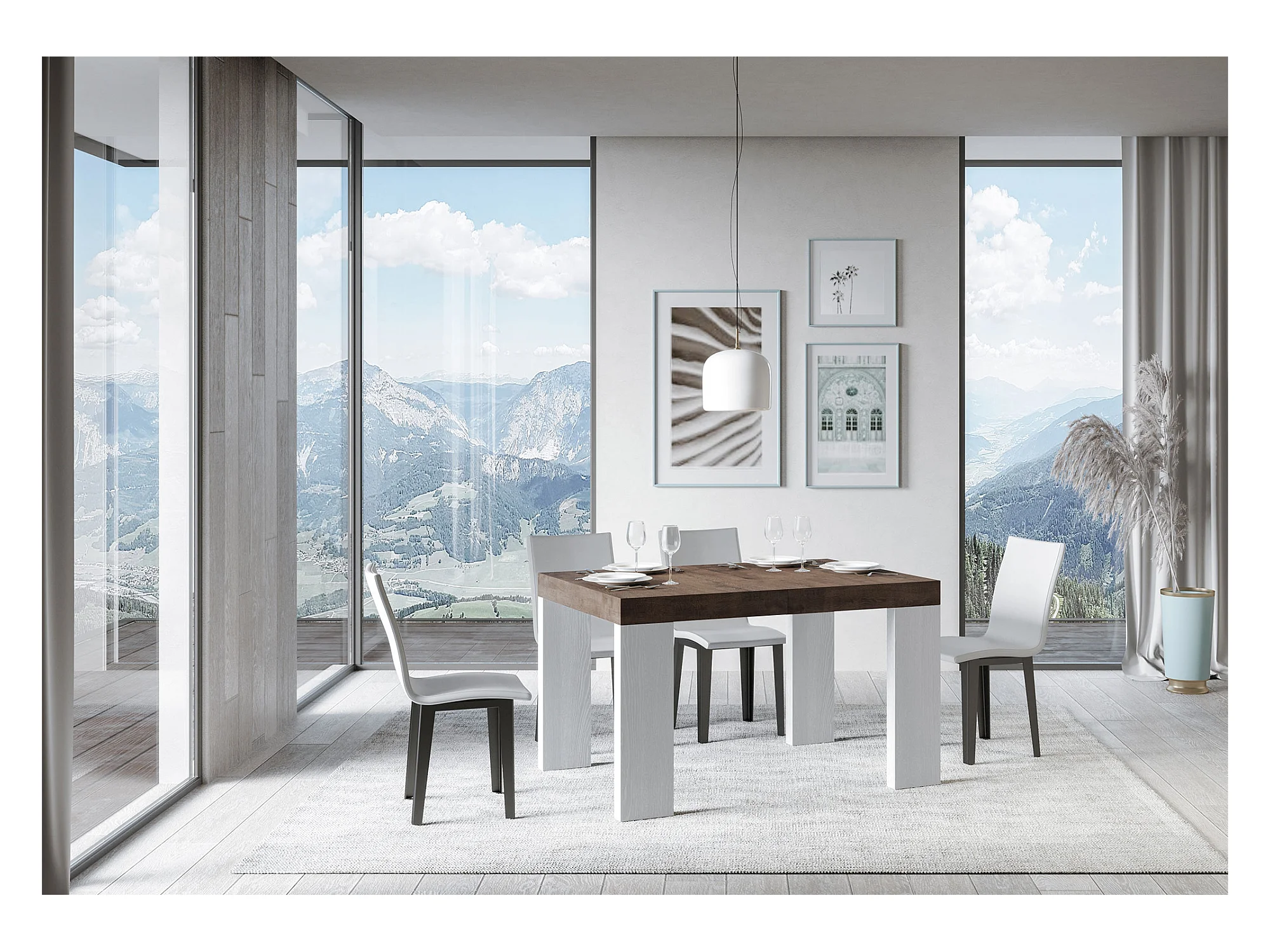 Table rectangulaire extensible blanche et bois noyer 130 à 234cm Ribo-4 pieds
