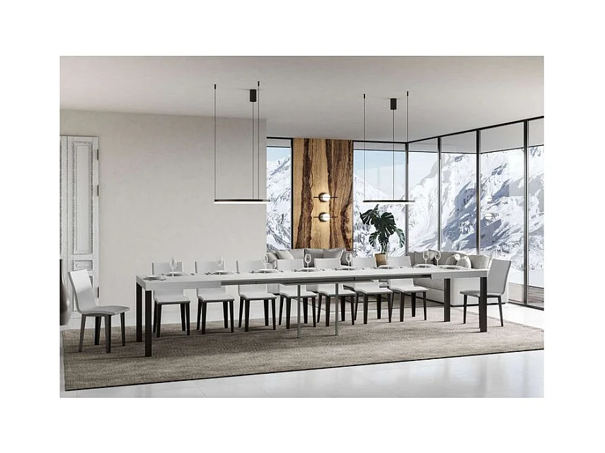 Table rectangulaire extensible orientale 6 à 20 personnes L 180 à 440cm blanc laqué et cadre métal anthracite Zakary