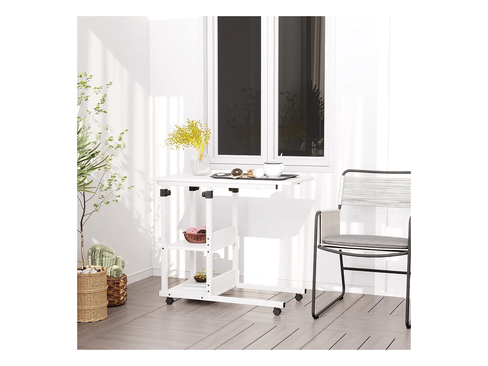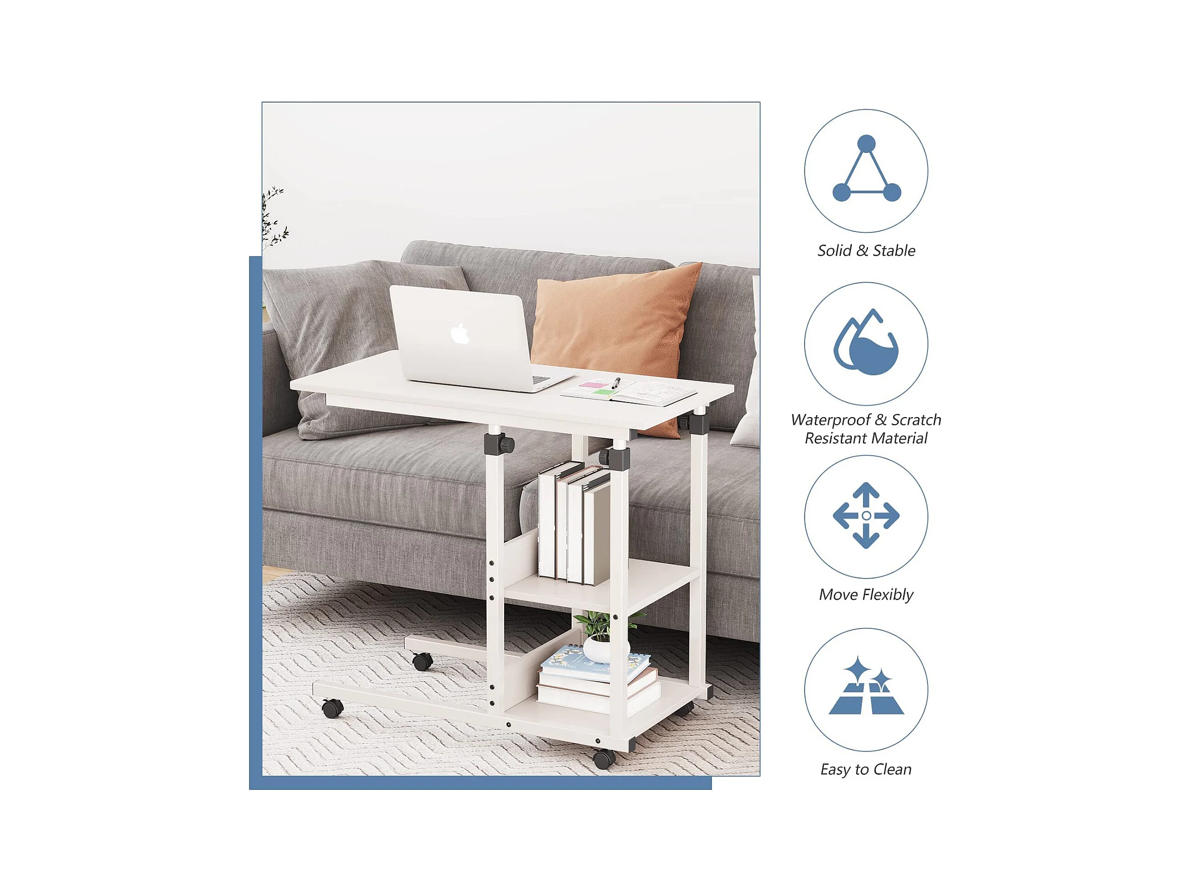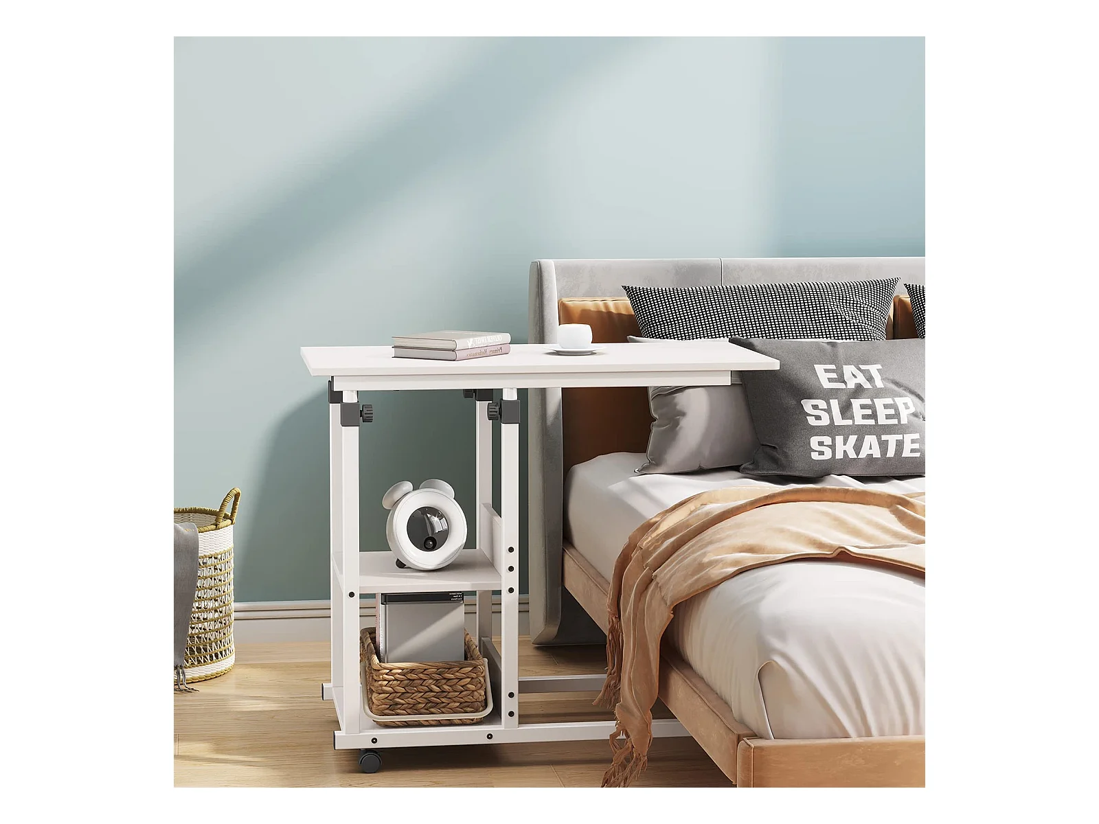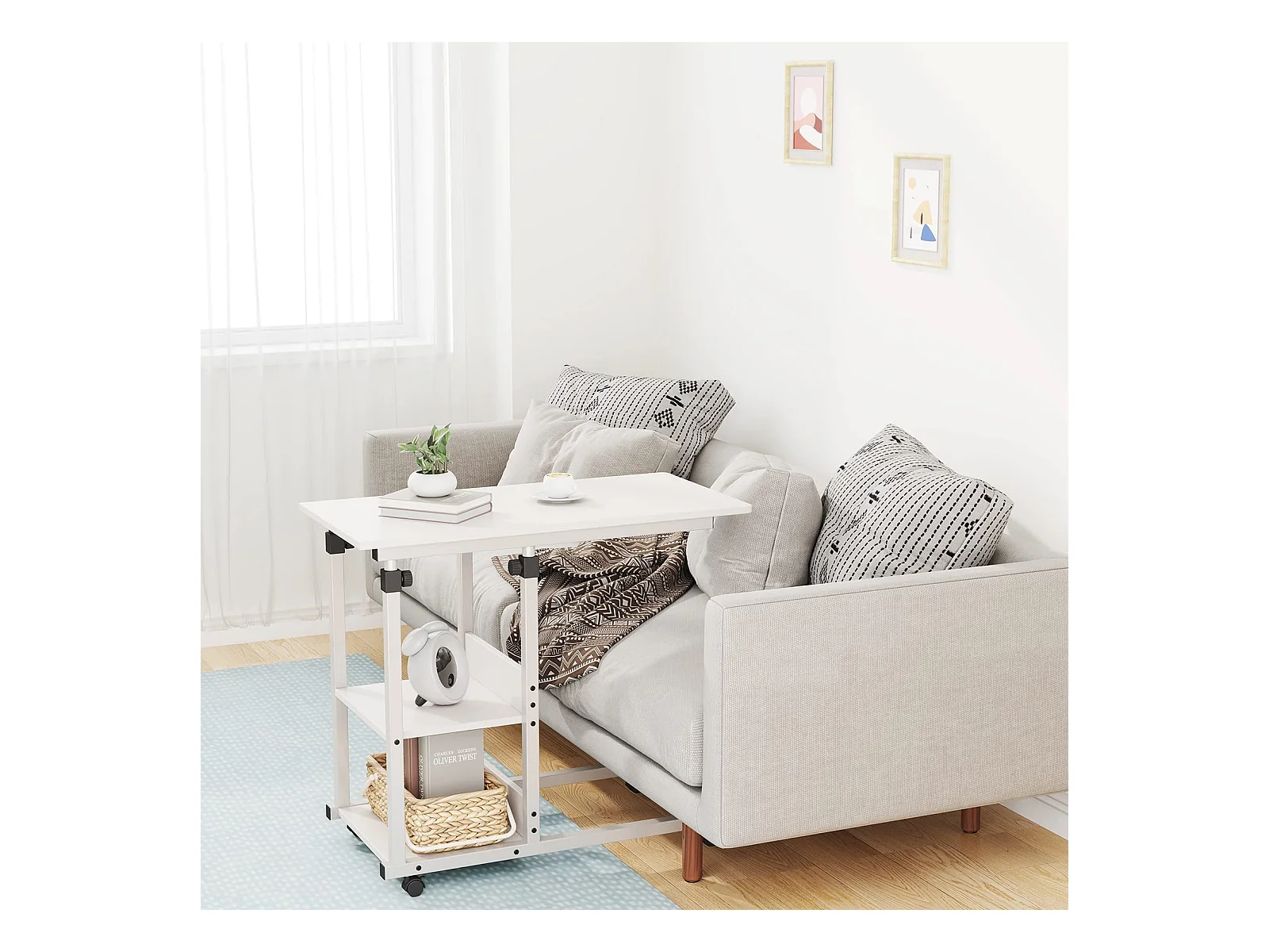Table Roulante, Table d'Appoint Mobile Réglable en Hauteur, Table Multiusage avec 4 roulettes et 2 Étagères de Rangement pour Canapé/Lit/Balcon-Blanc