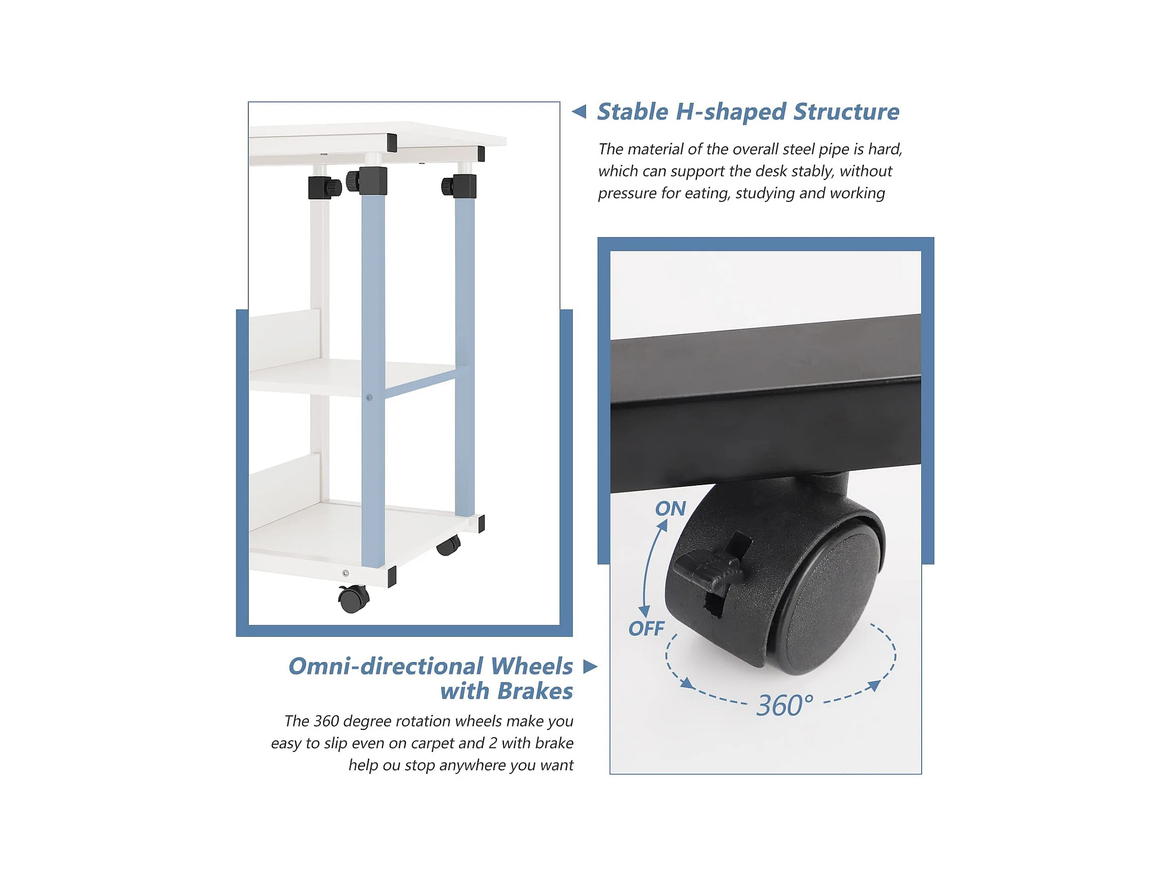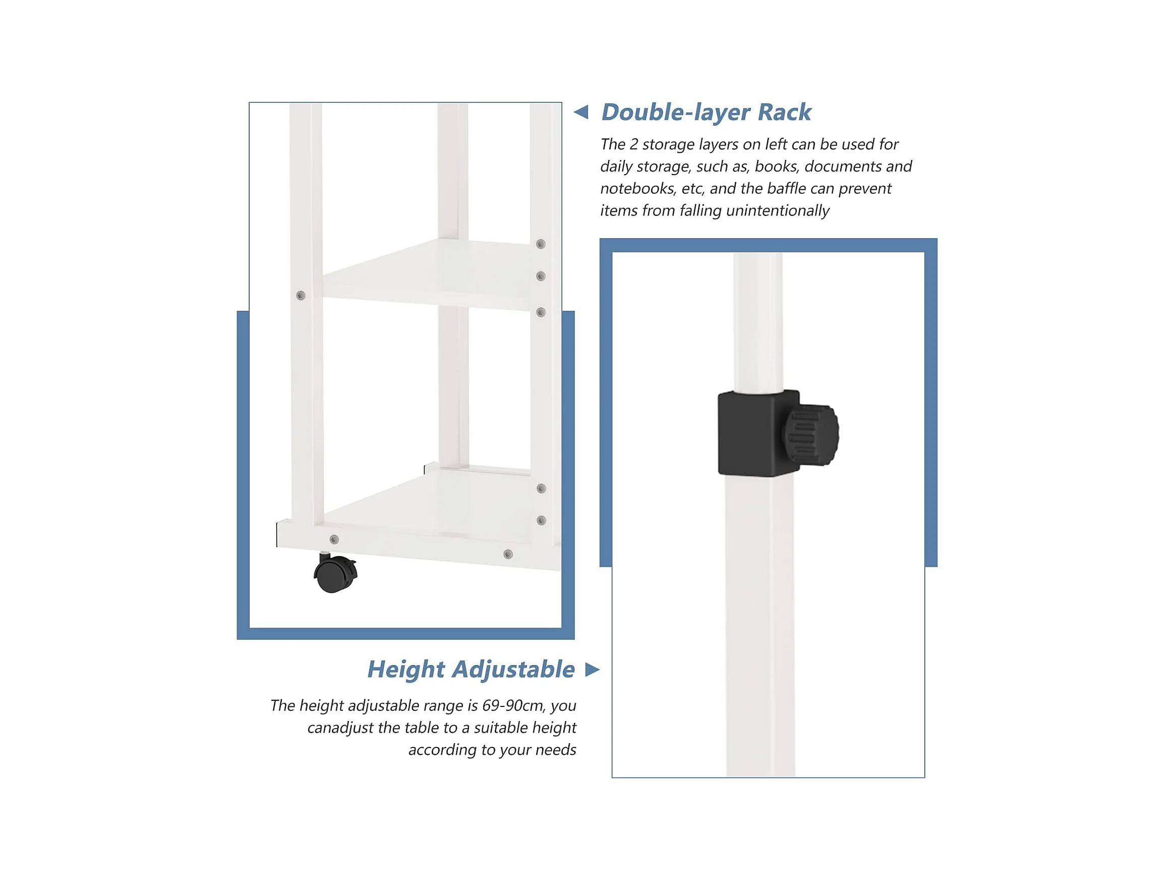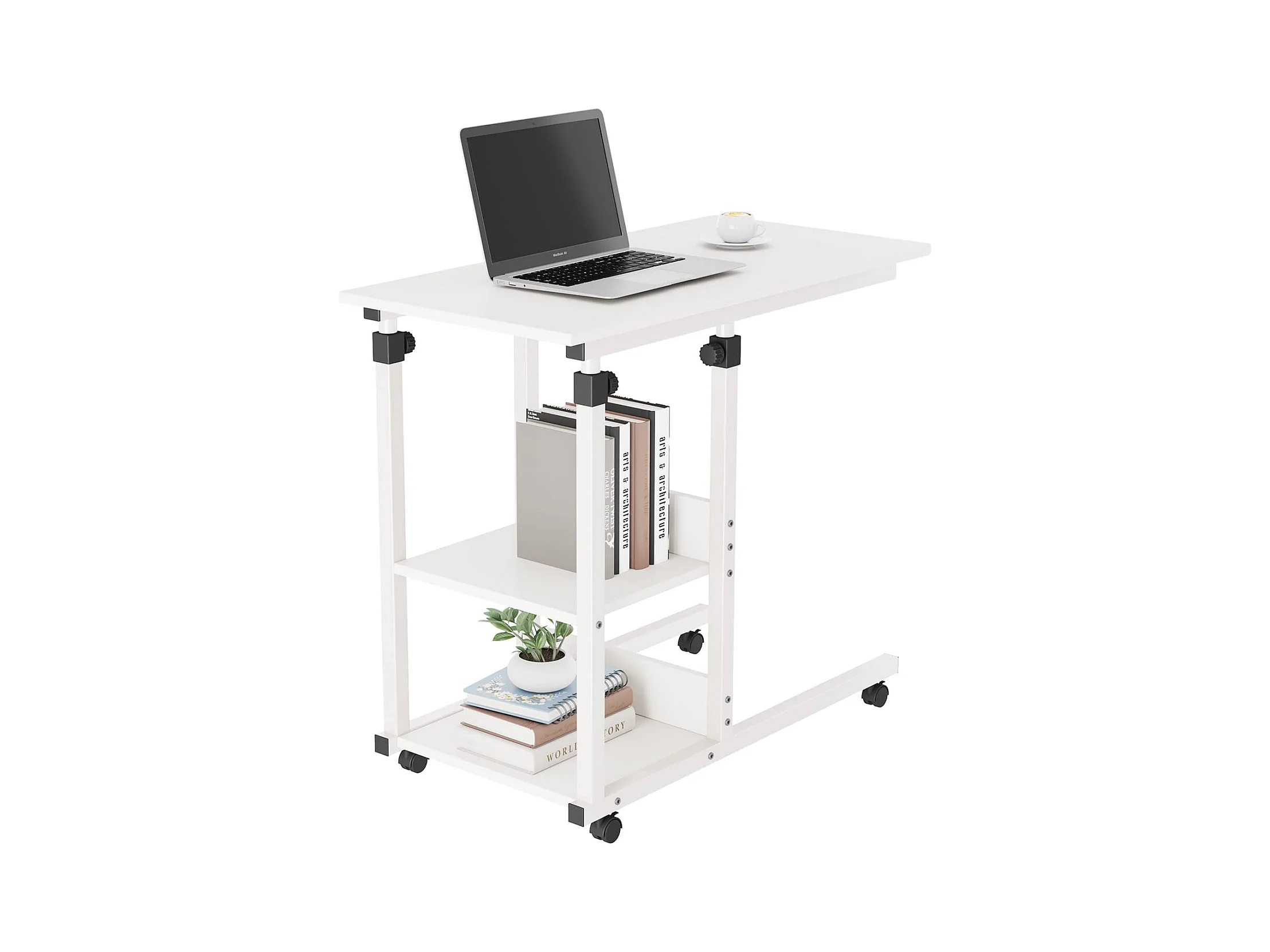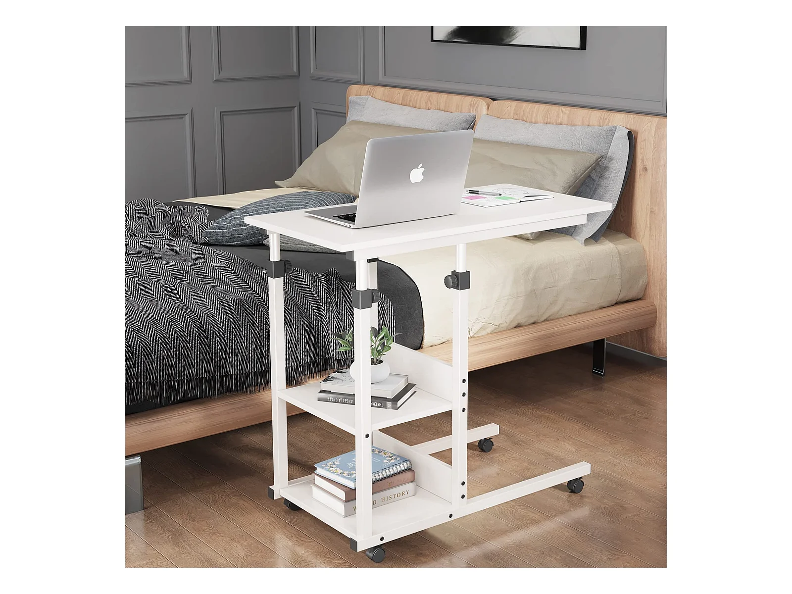 Table Roulante, Table d'Appoint Mobile Réglable en Hauteur, Table Multiusage avec 4 roulettes et 2 Étagères de Rangement pour Canapé/Lit/Balcon-Blanc