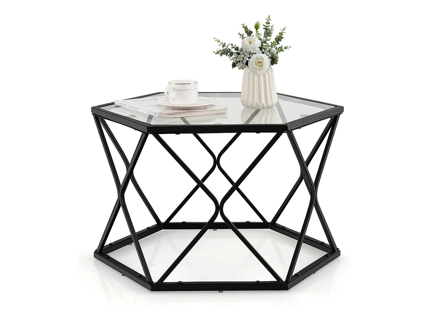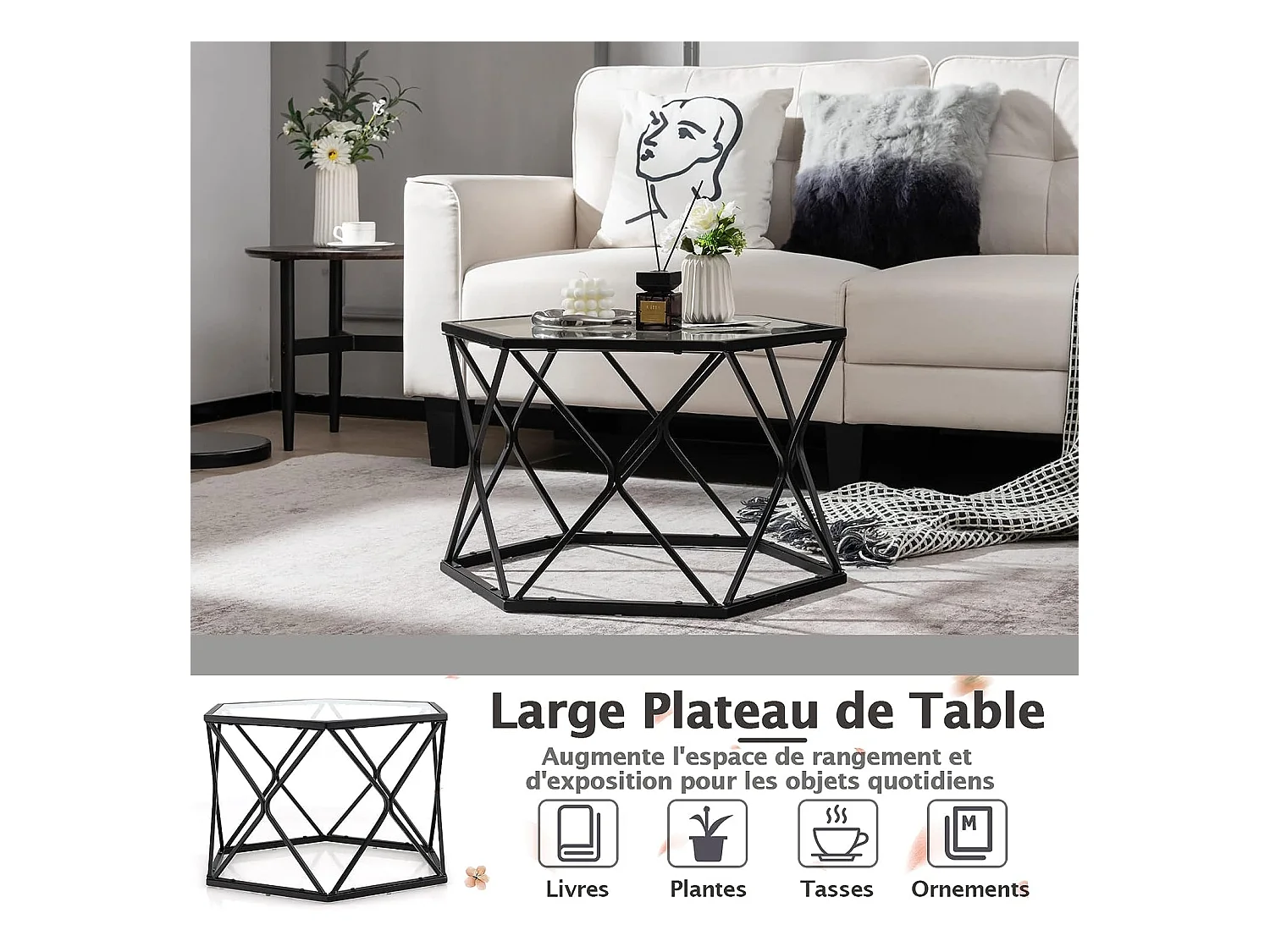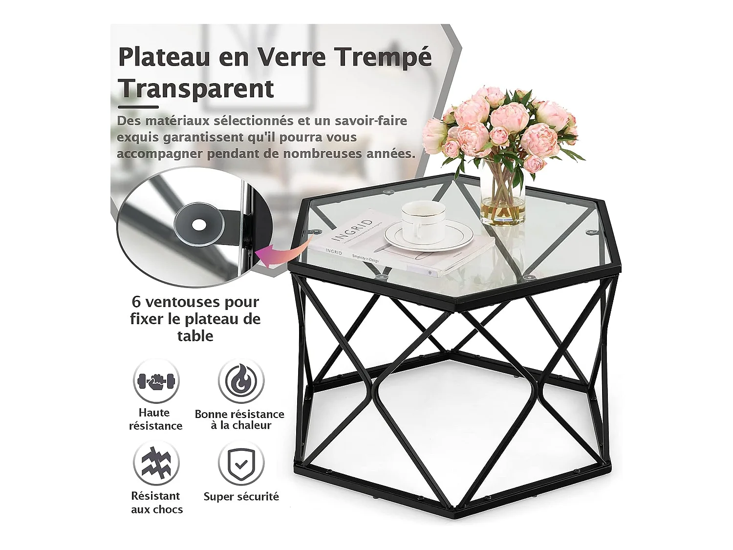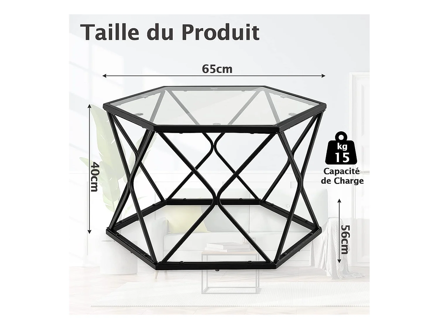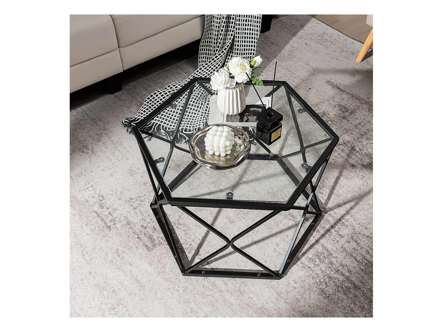 Table Salon Basse avec Plateau en Verre Trempé, 65 x 56 x 40cm, Noir