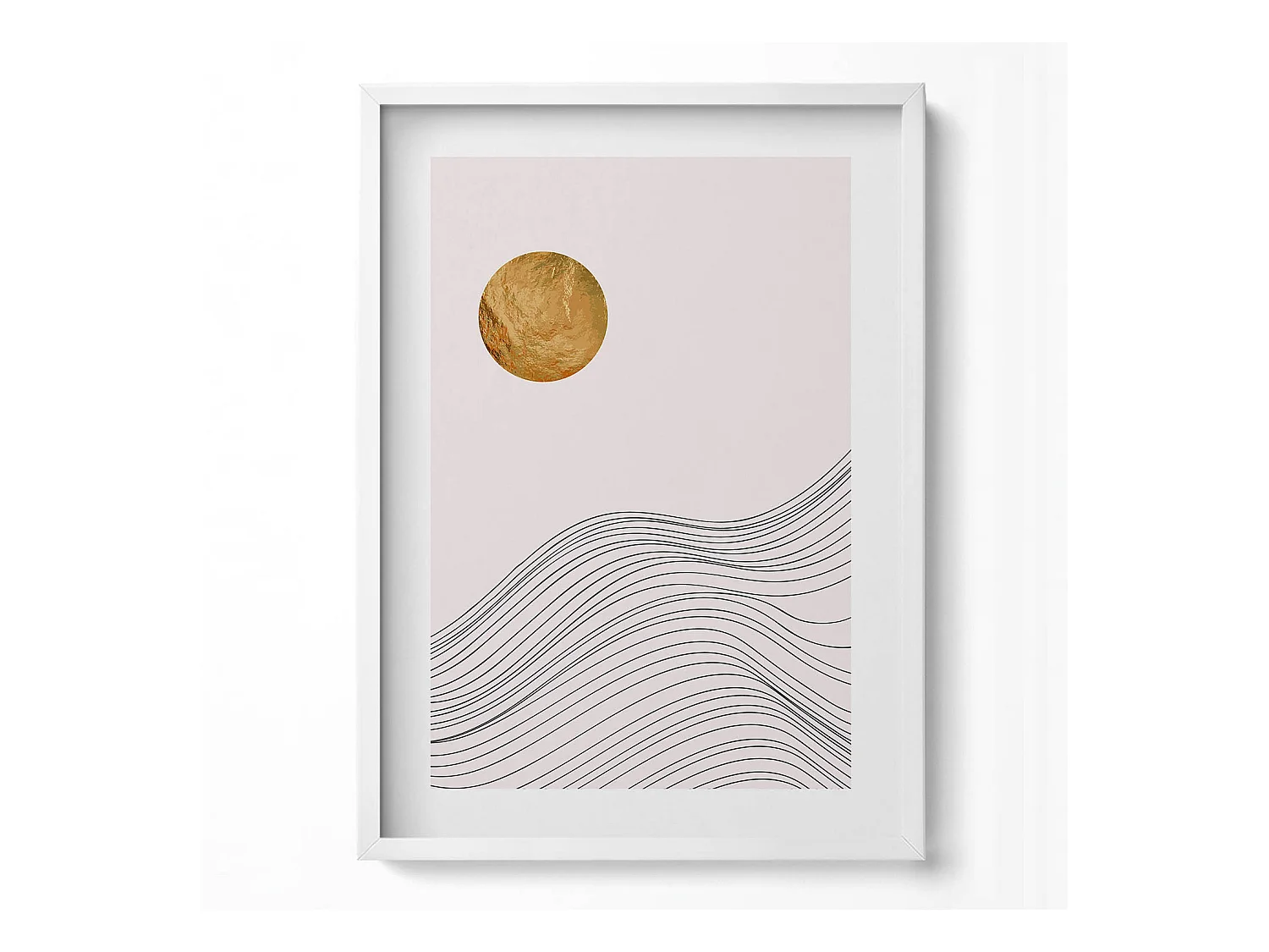 Tableau décoratif avec cadre blanc, Abstraction minimaliste avec détails dorés 50 x 70 cm– Parfait pour le salon ou la chambre