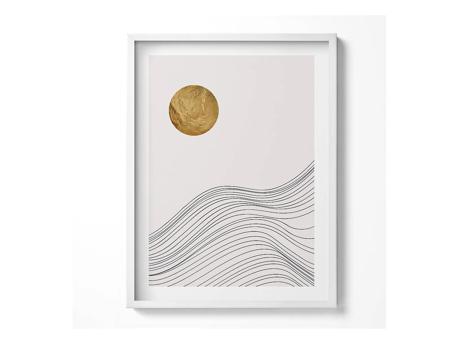 Tableau décoratif avec cadre blanc, Abstraction minimaliste avec détails dorés 60 x 80 cm– Parfait pour le salon ou la chambre