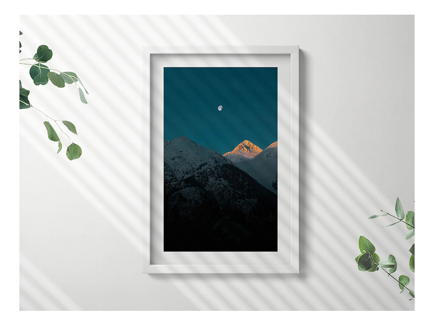 Tableau décoratif avec cadre blanc, Coucher de soleil dans les montagnes 40 x 60 cm– Parfait pour le salon ou la chambre