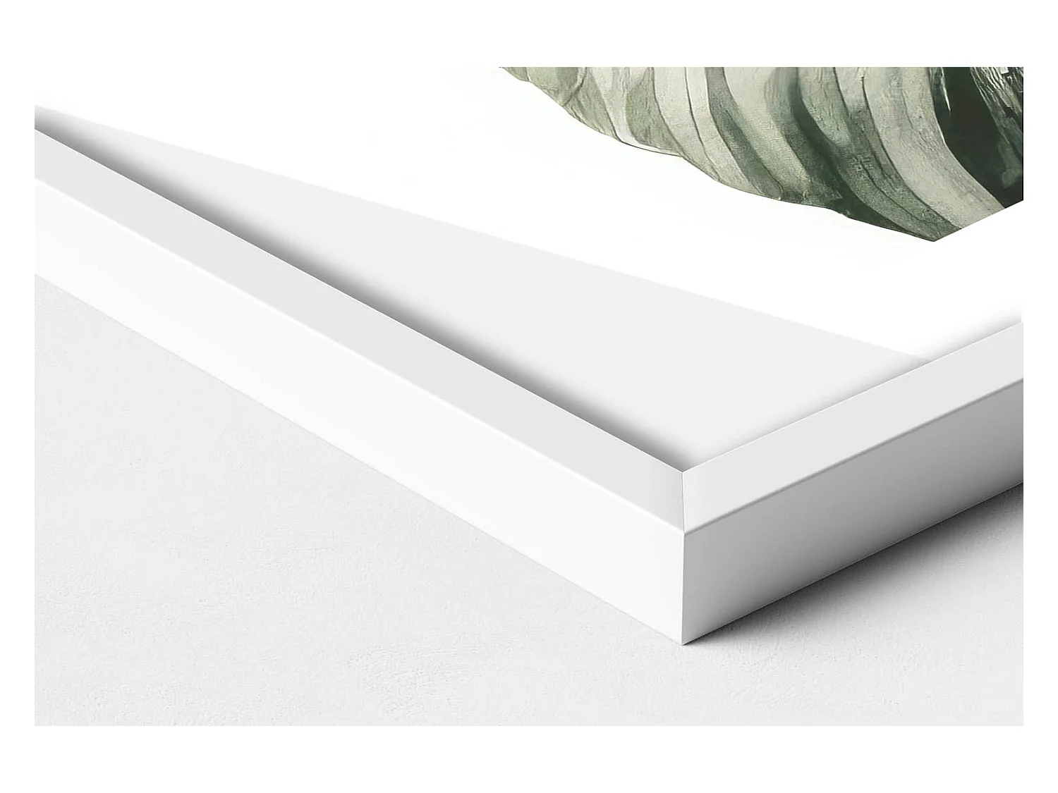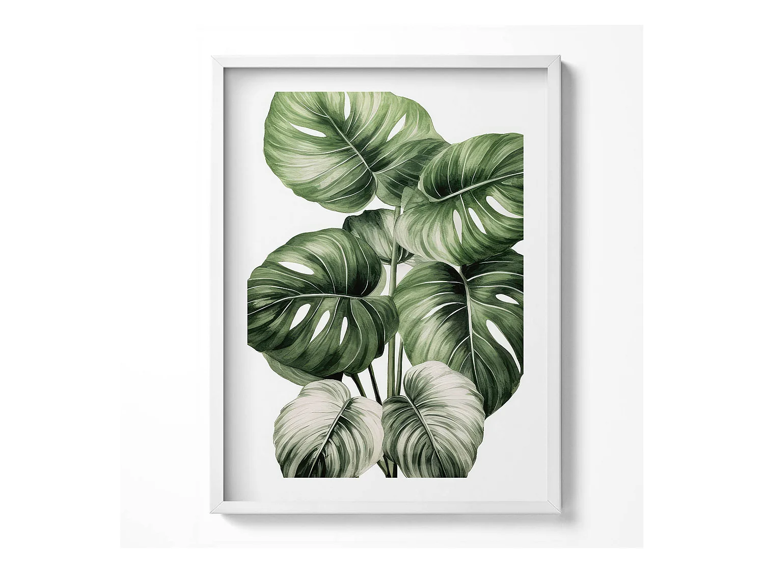 Tableau décoratif avec cadre blanc, Feuilles de monstera peintes 60 x 80 cm– Parfait pour le salon ou la chambre