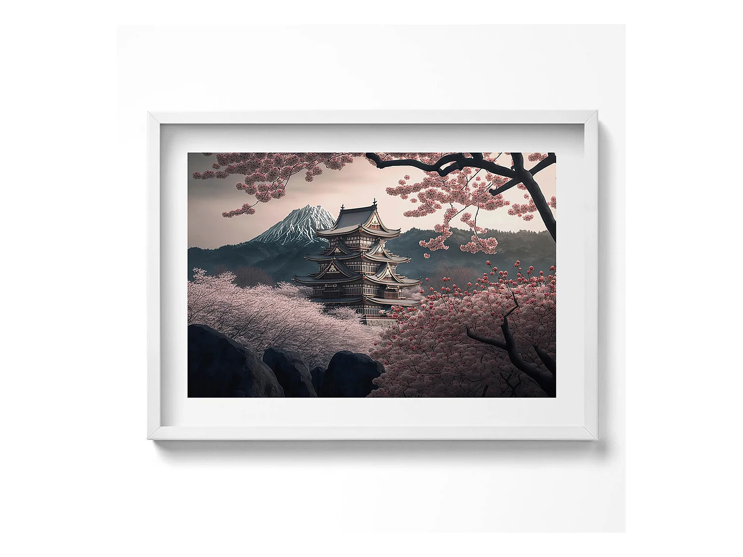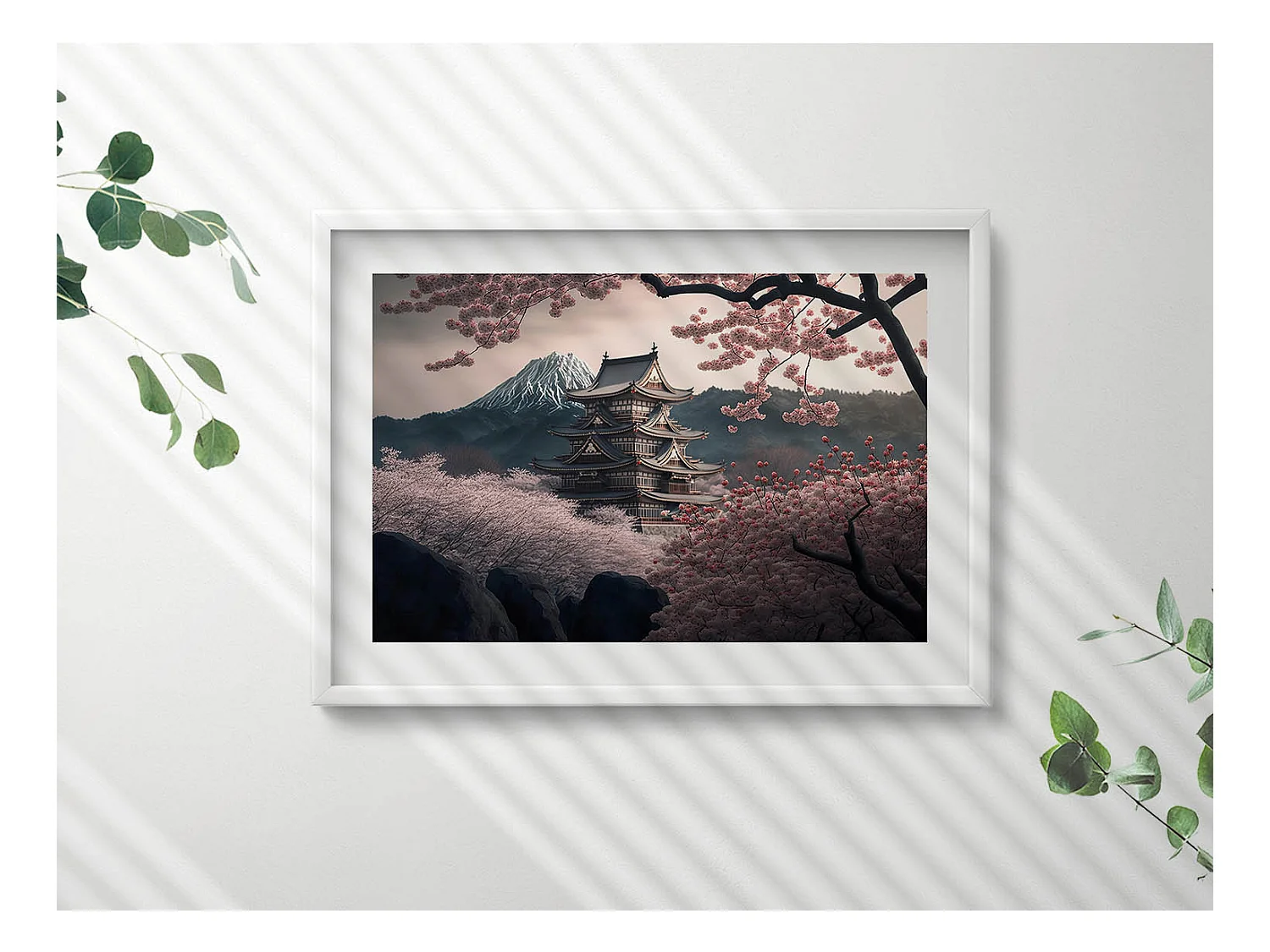 Tableau décoratif avec cadre blanc, Tour asiatique et fleurs de cerisier 70 x 50 cm– Parfait pour le salon ou la chambre