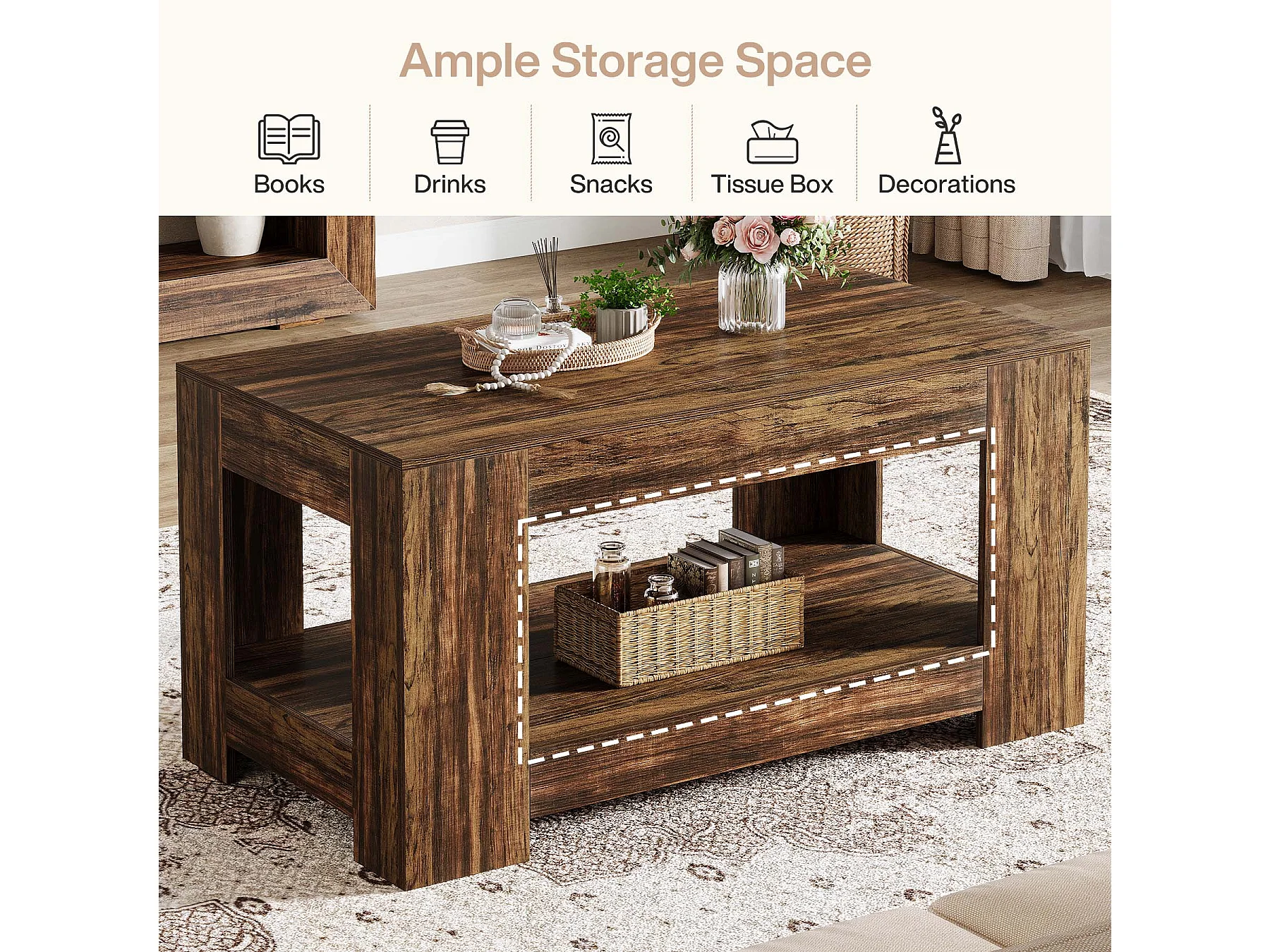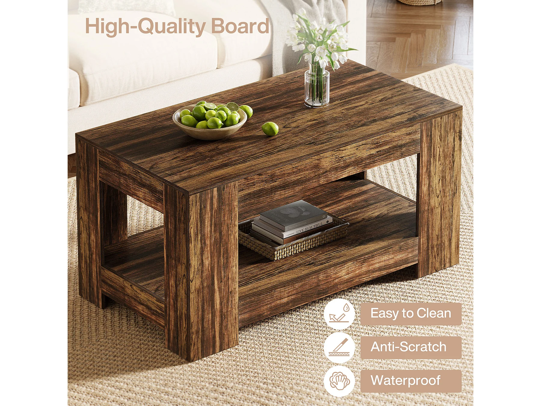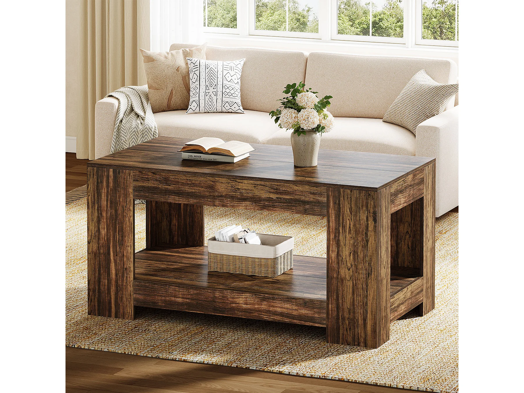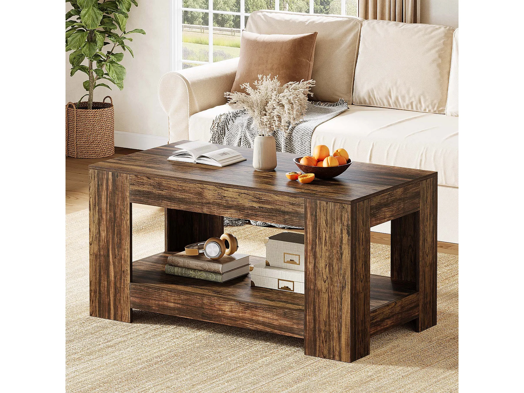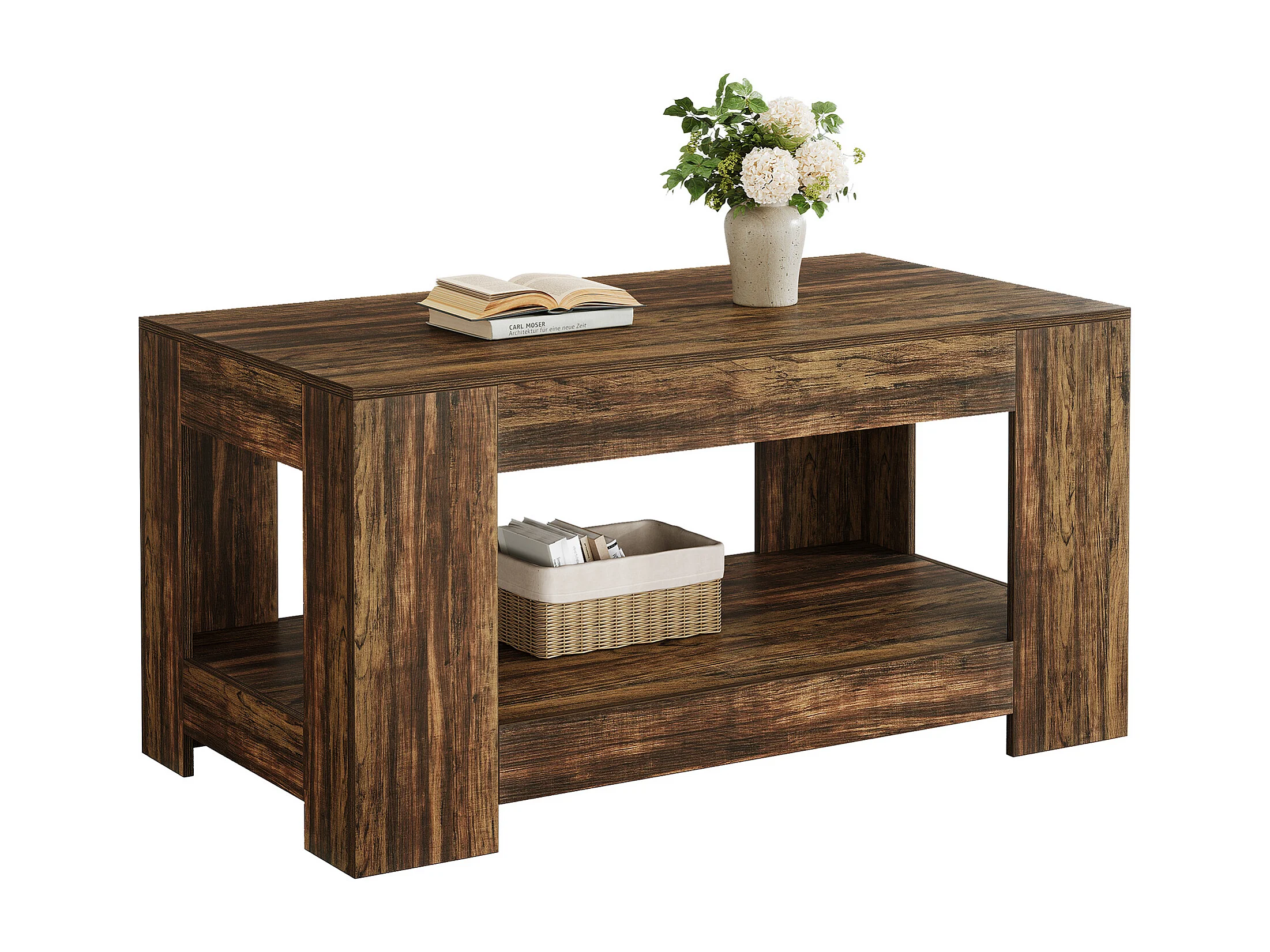 Tables basses de style ferme, table centrale rustique simple à deux niveaux avec rangement pour salon, marron foncé, montage facile