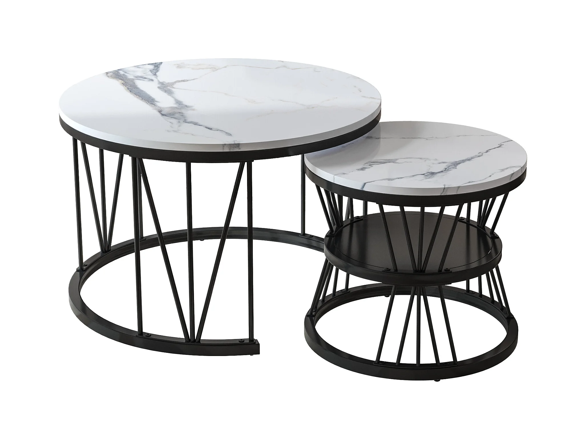 Tables basses rondes gigognes – Plateau effet marbre blanc avec structure en métal noir en forme de V – Design moderne et élégant