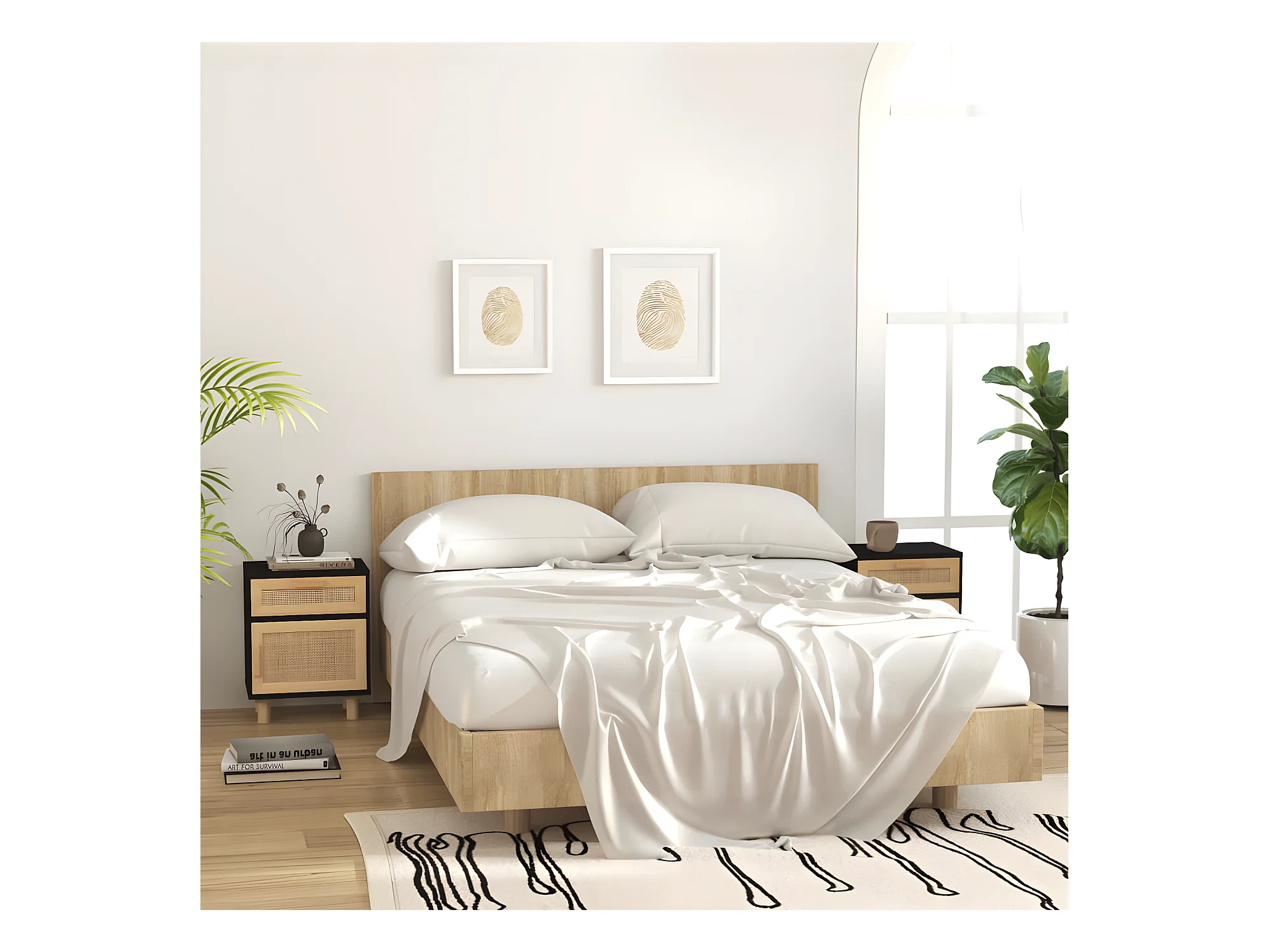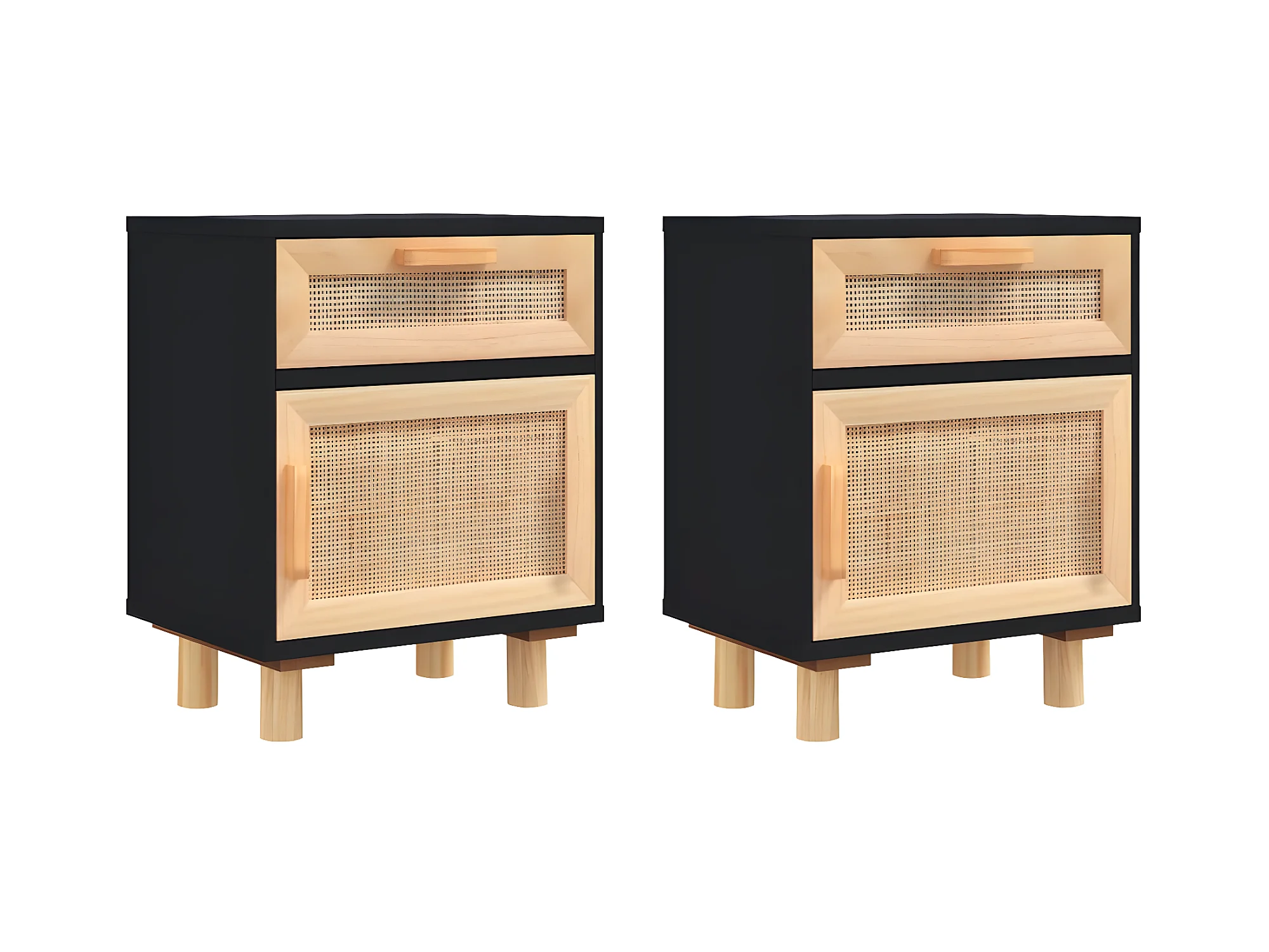 Tables de chevet 2 pièces Noir Bois de pin massif et rotin naturel