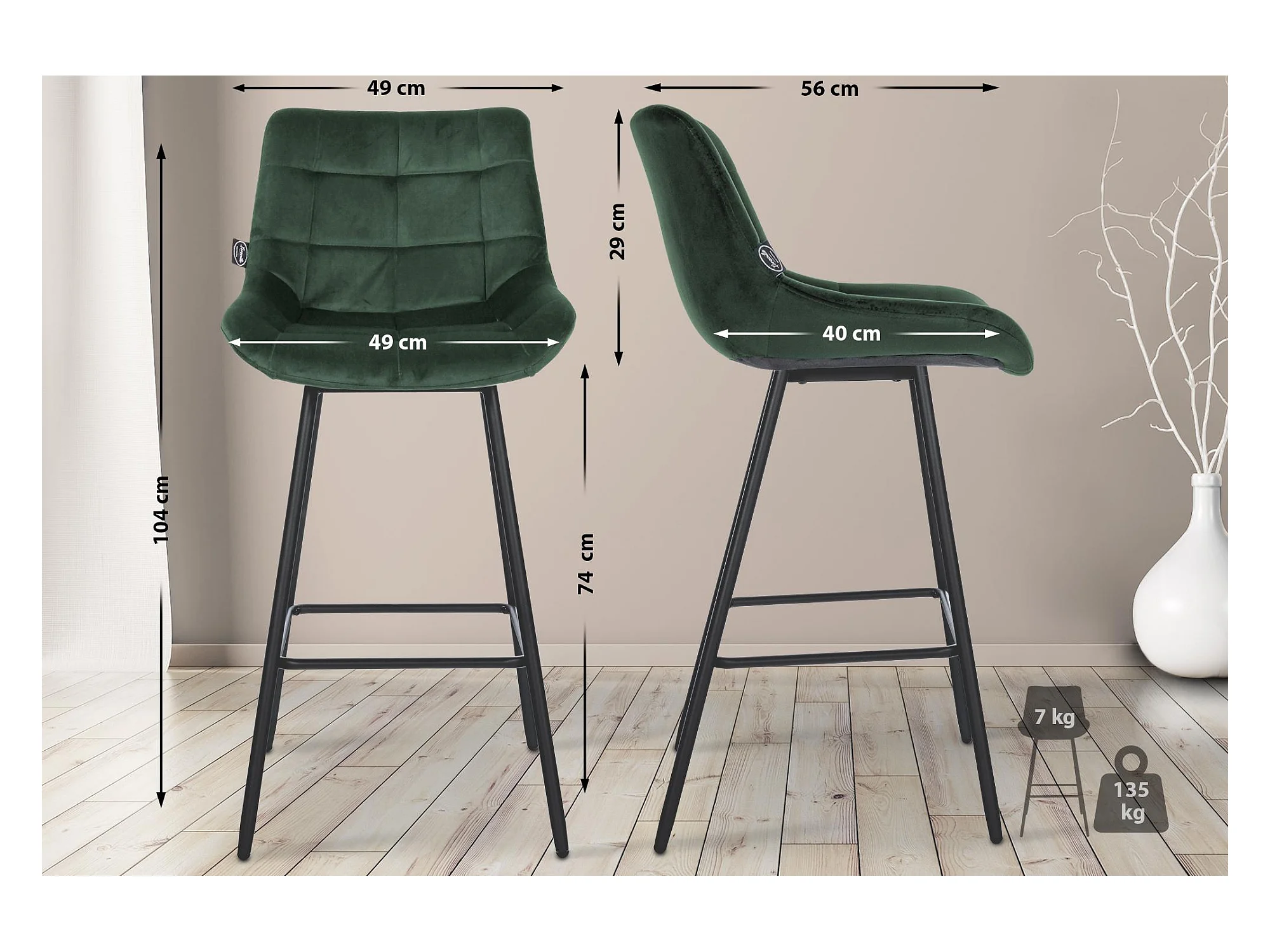 Tabouret de bar - Velours & Blanc - Vert foncé - Braga