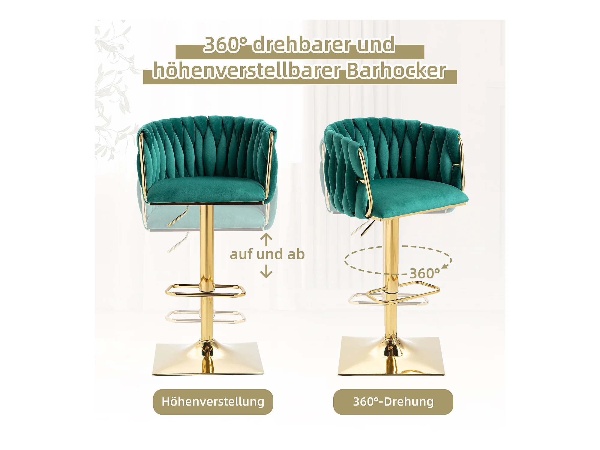 Tabouret de bar 360° pivotant, design moderne, velours, cadre doré, set de 2 pièces, hauteur réglable (54x48x78-97 cm)