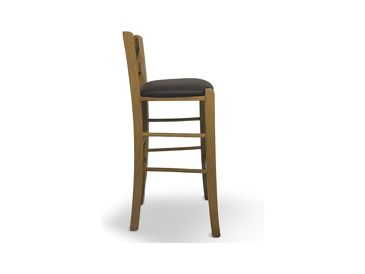 Tabouret en bois de noyer clair avec dossier h 66cm et assise en simili cuir marron