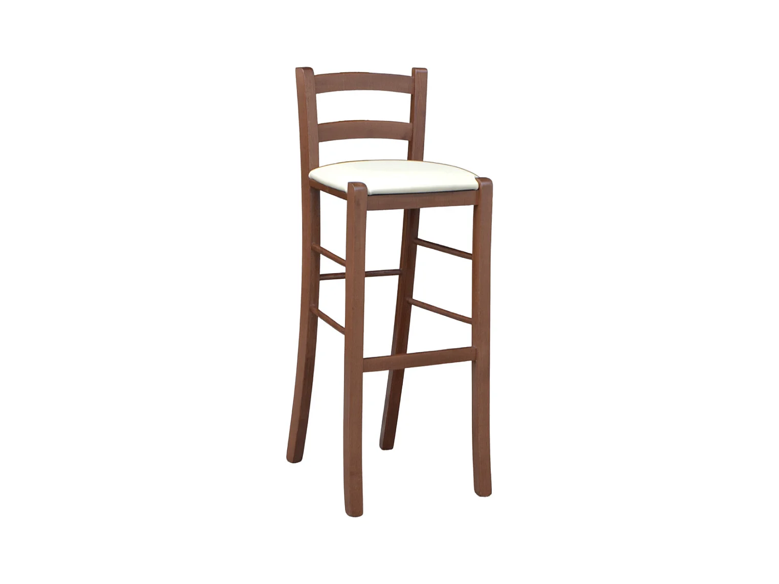 Tabouret en bois de noyer foncé avec dossier h 80 cm assise simili cuir crème