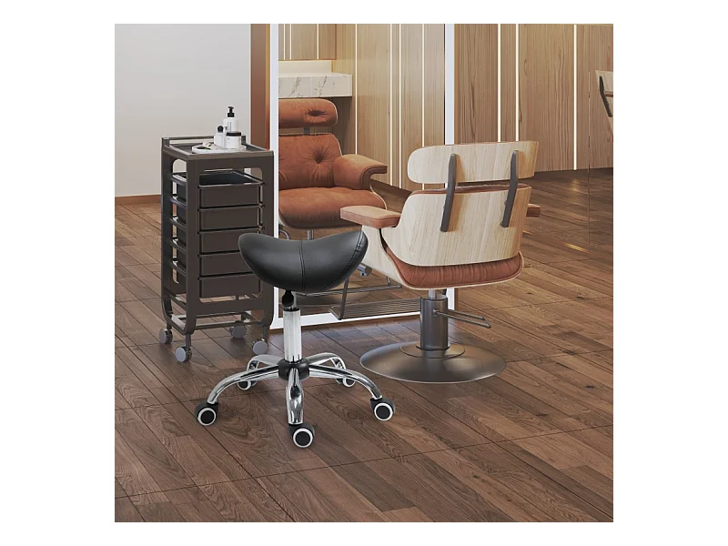 Tabouret roulant réglable en hauteur, pivotant avec roulettes, revêtement en cuir synthétique noir, parfait pour coiffure et bureau