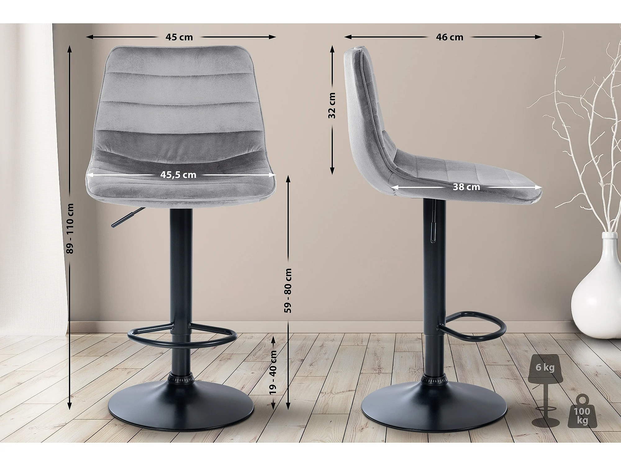 Tabouret de bar - Velours & Métal - Gris - Lex