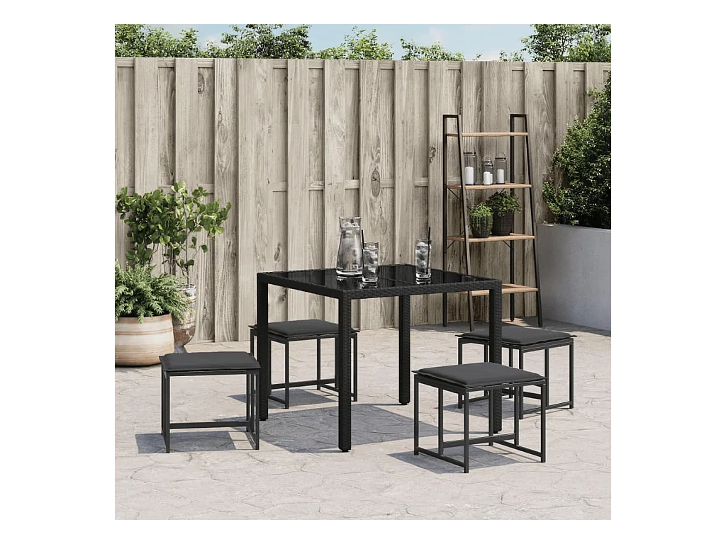 Tabouret de jardin avec coussin noir 55x55x37 cm résine tressée