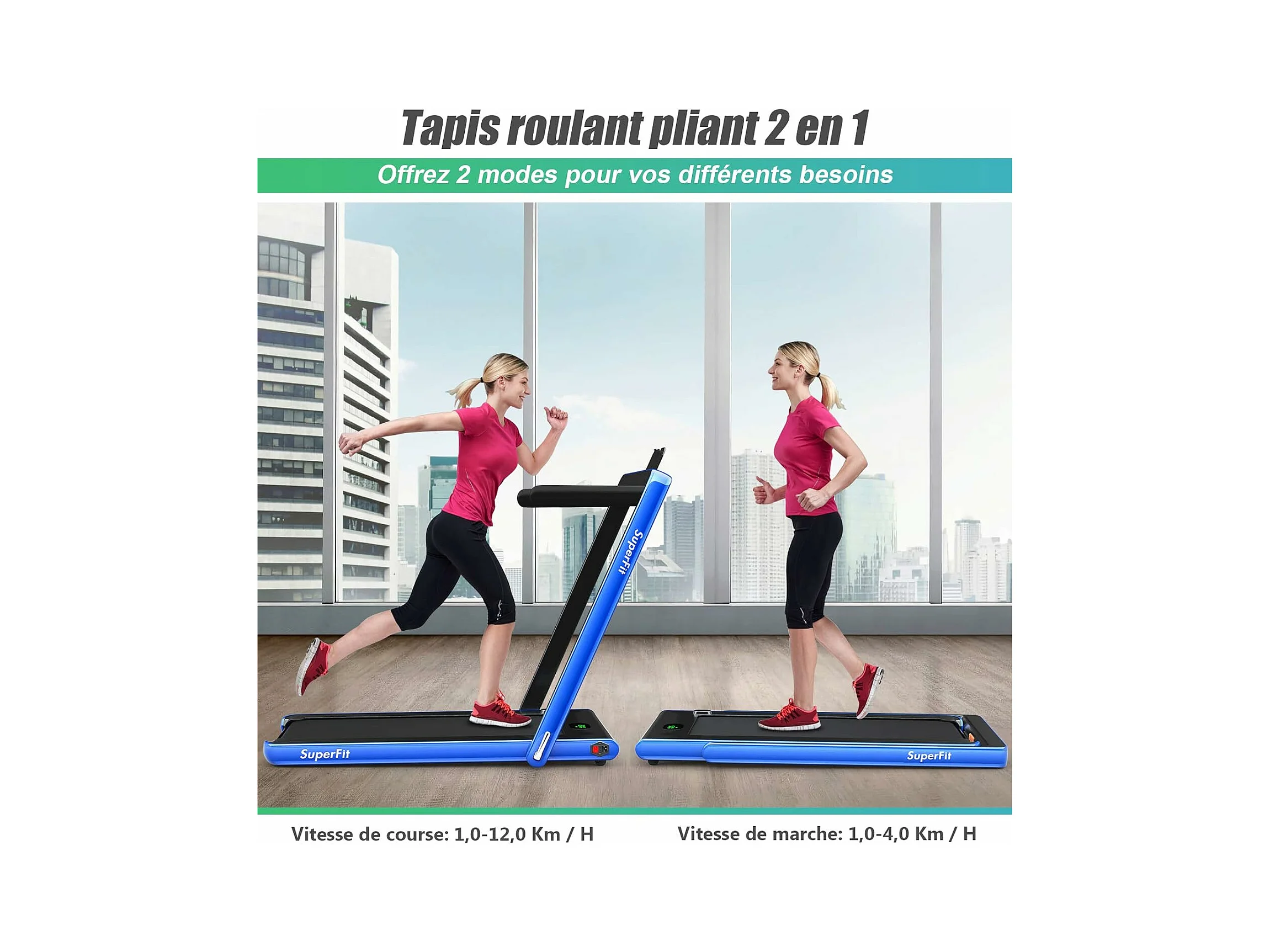 Tapis de Course Pliable 2 en 1/Tapis Roulant Électrique Motorisé 1-12 KM/H avec Application, Télécommande, Écran LED, pour Maison et Bureau, Bleu