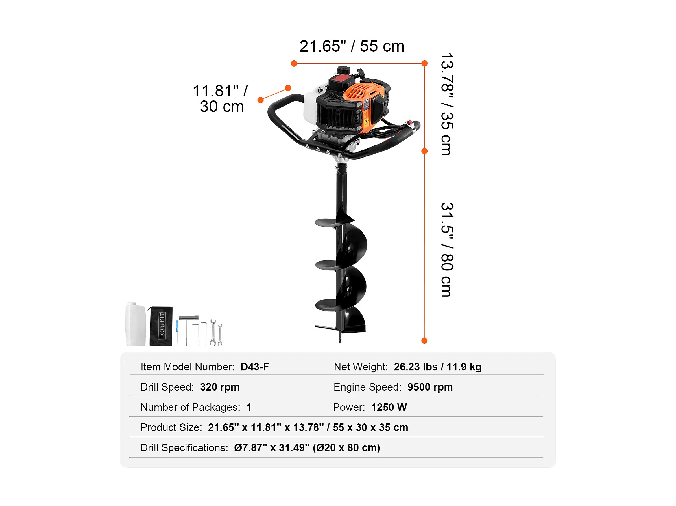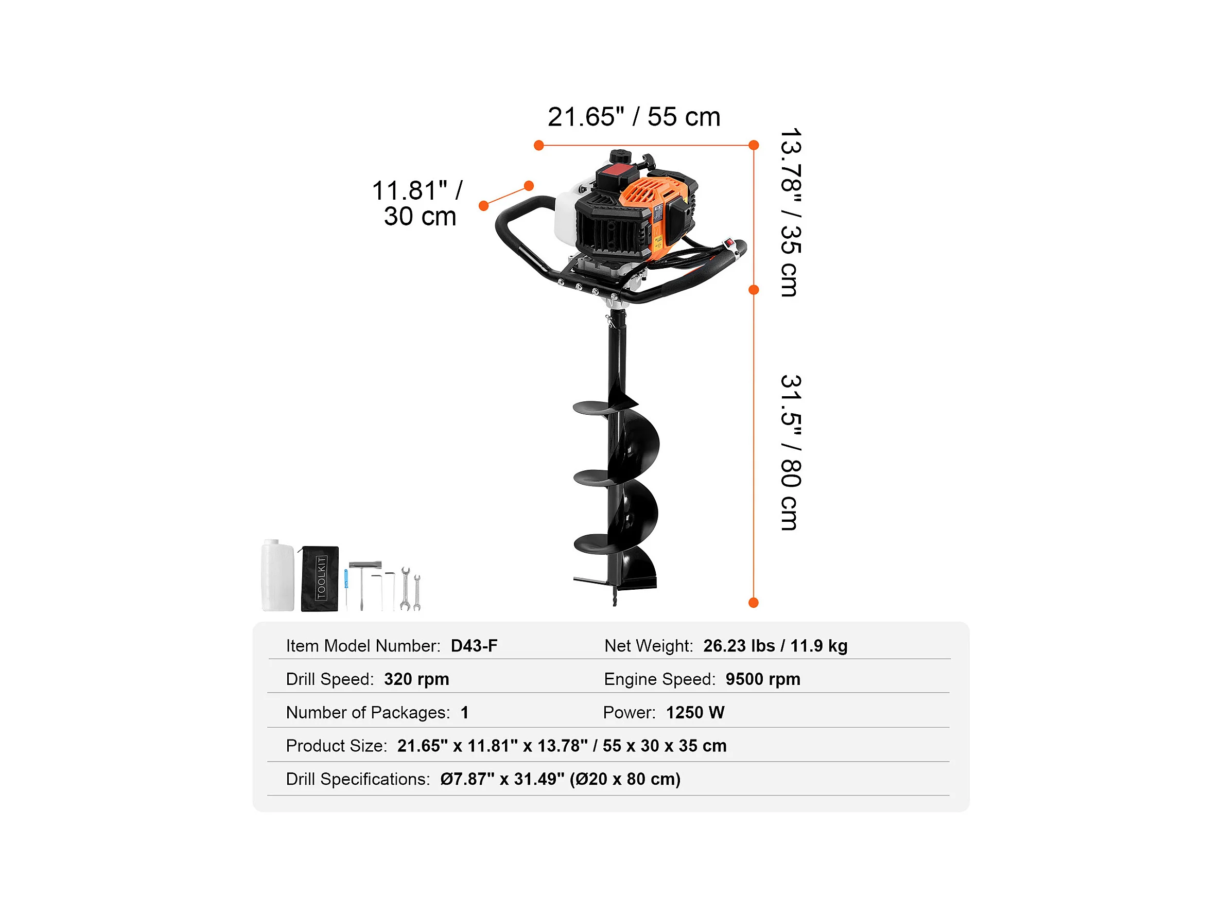 Tarière à Essence Thermique, SucceBuy Tarière à Gaz 43CC 1250W 20.32 CM Forets pour Jardin