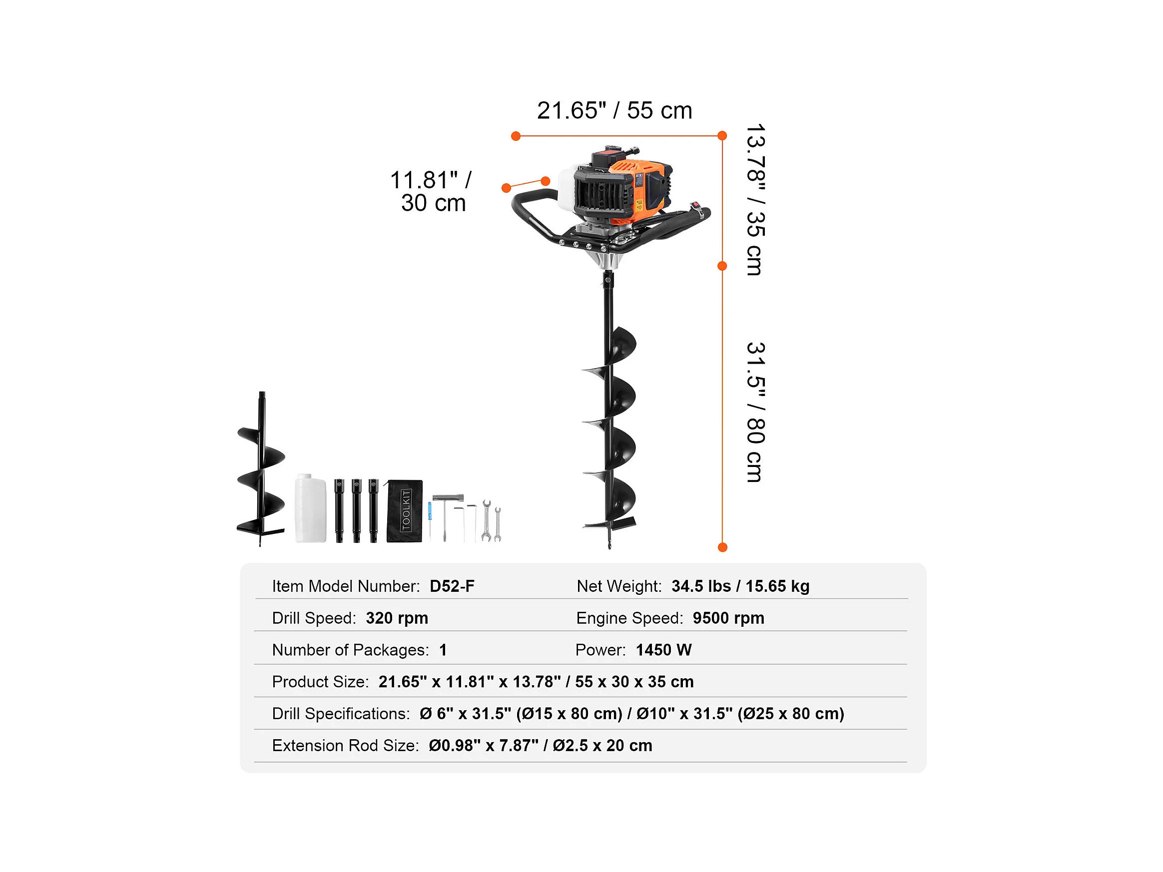 Tarière À Gaz SucceBuy 52CC 1450W Avec Forets De 15.2cm Et 25.4cm Et 3 Tiges D'Extension