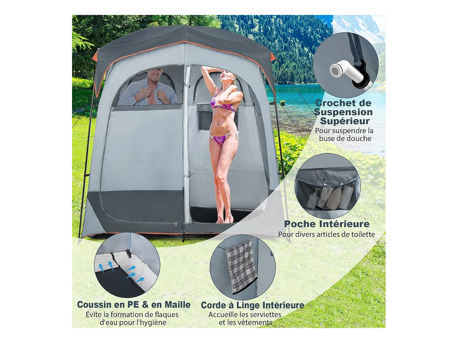 Tente Cabine de Douche Portable 2 Personnes en 2 Parties avec Bâche de Pluie Amovible Corde à Linge, Crochet 210x107x210 cm