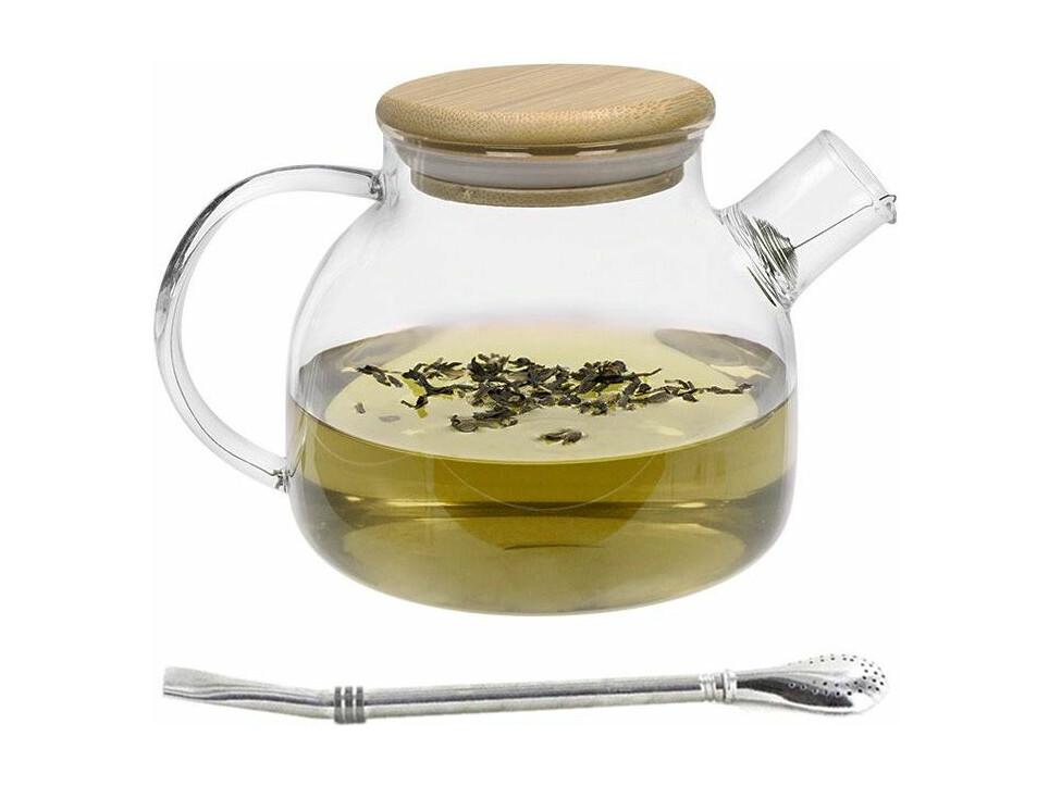 Théière en verre et bambou 1 L + paille inox avec filtre