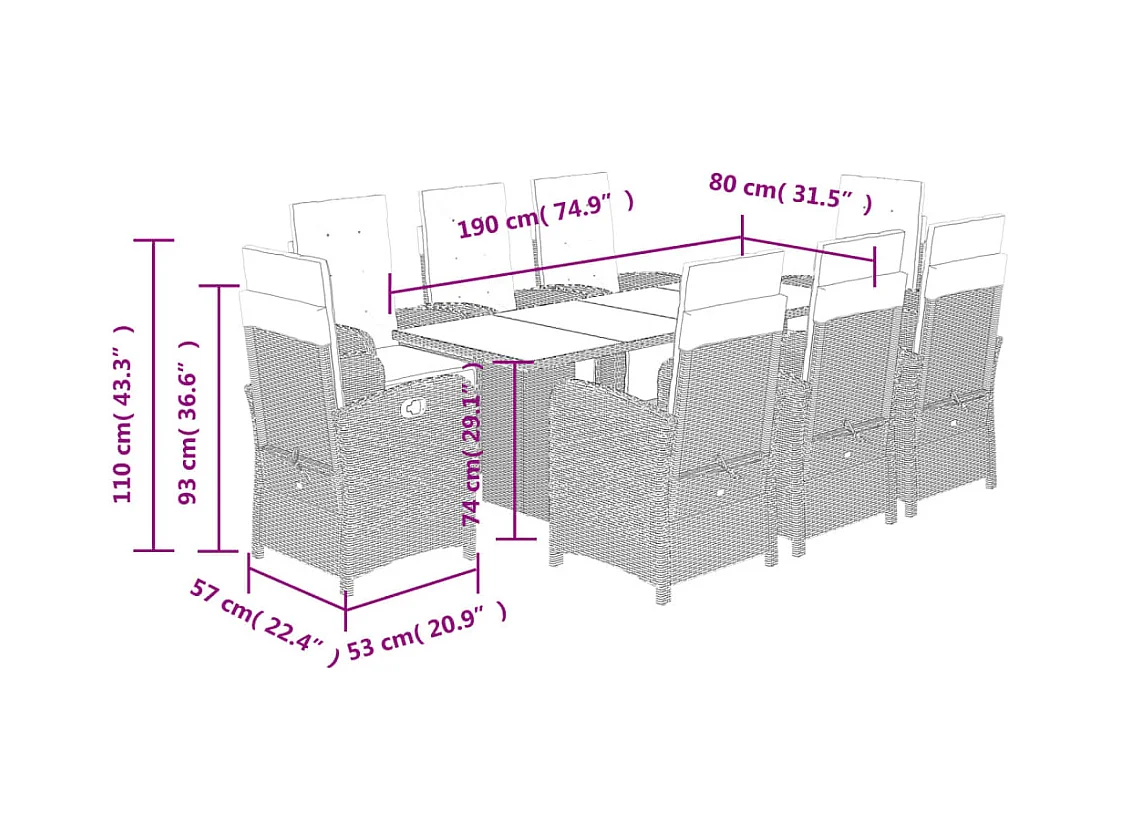 Anselm Ensemble à manger de jardin 9 pcs coussins gris résine tressée
