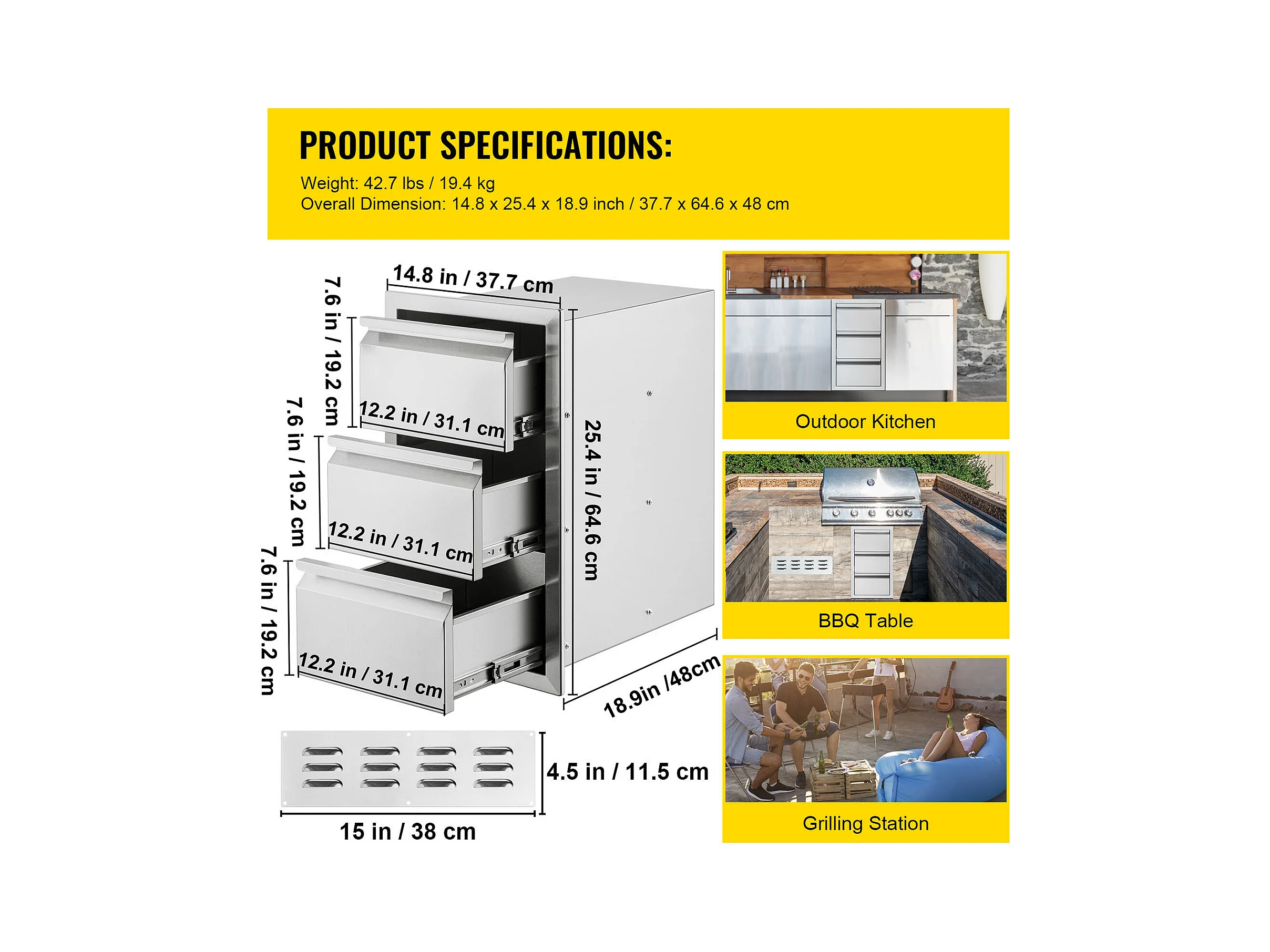 Tiroir à Triple Accès SucceBuy, à 3 Espaces de Tiroirs de Rangement en Acier Inoxydable, 38x48x65 cm, pour Cuisiner à l'Extérieur Faire, Barbecue Ranger