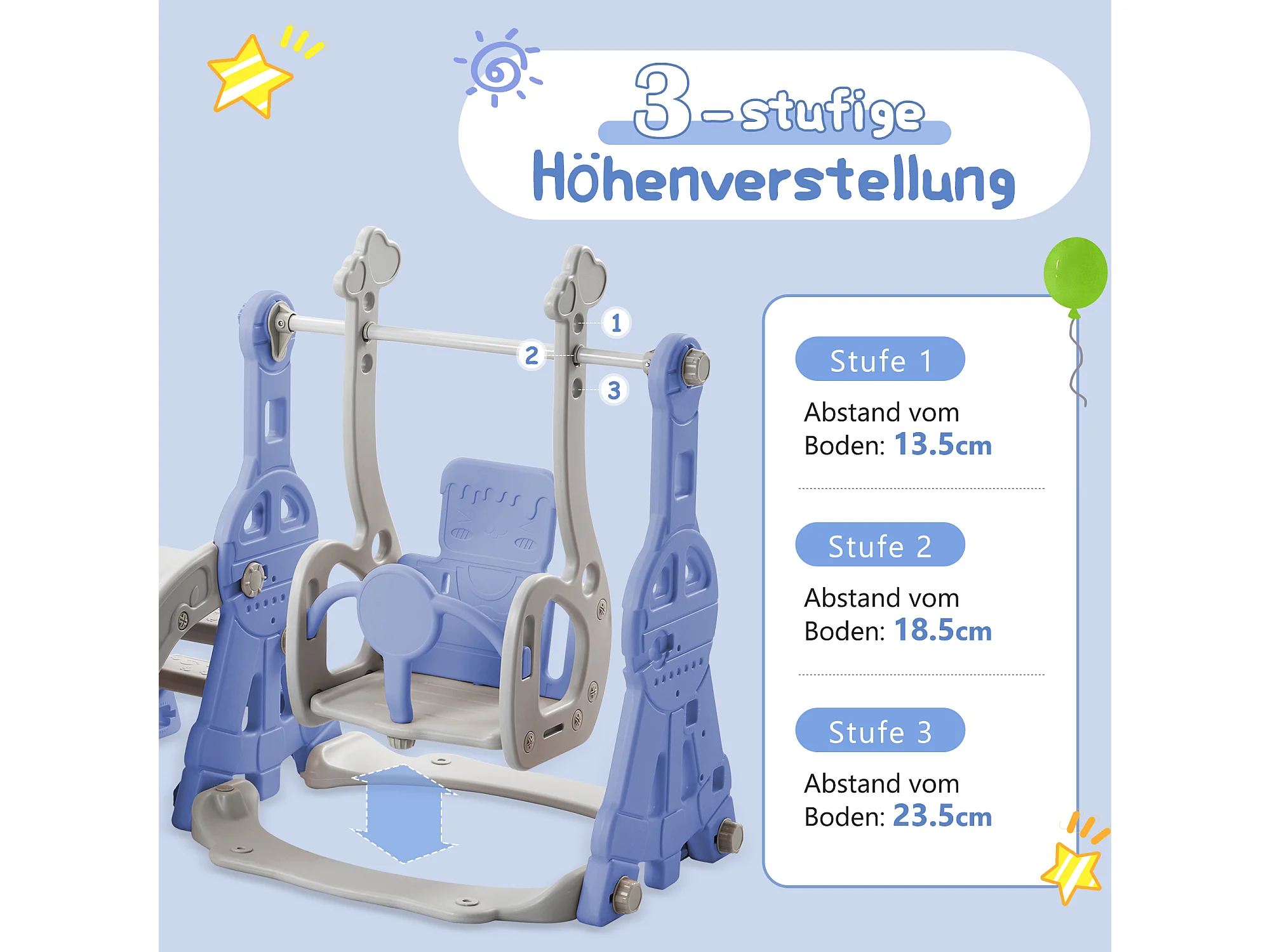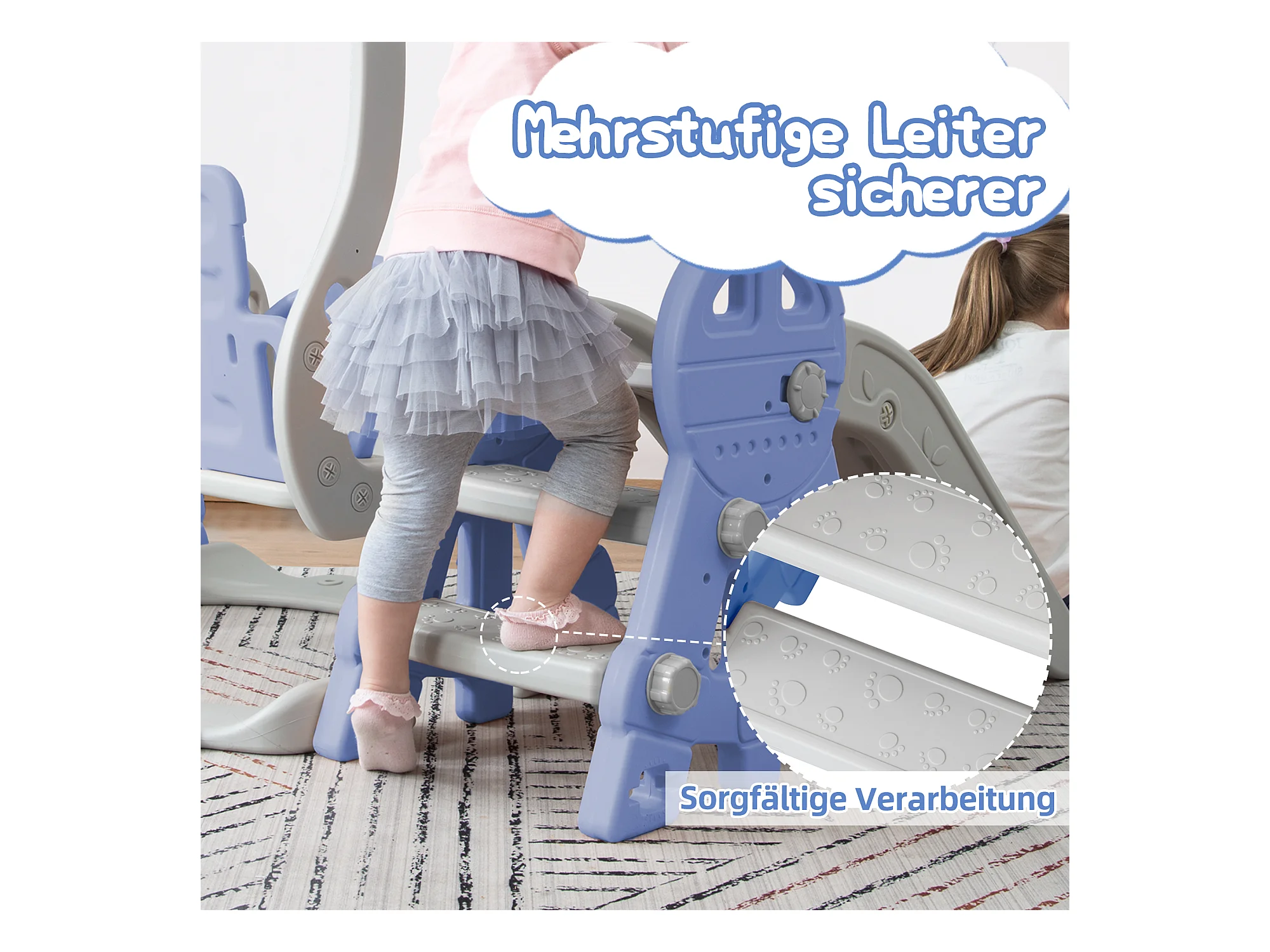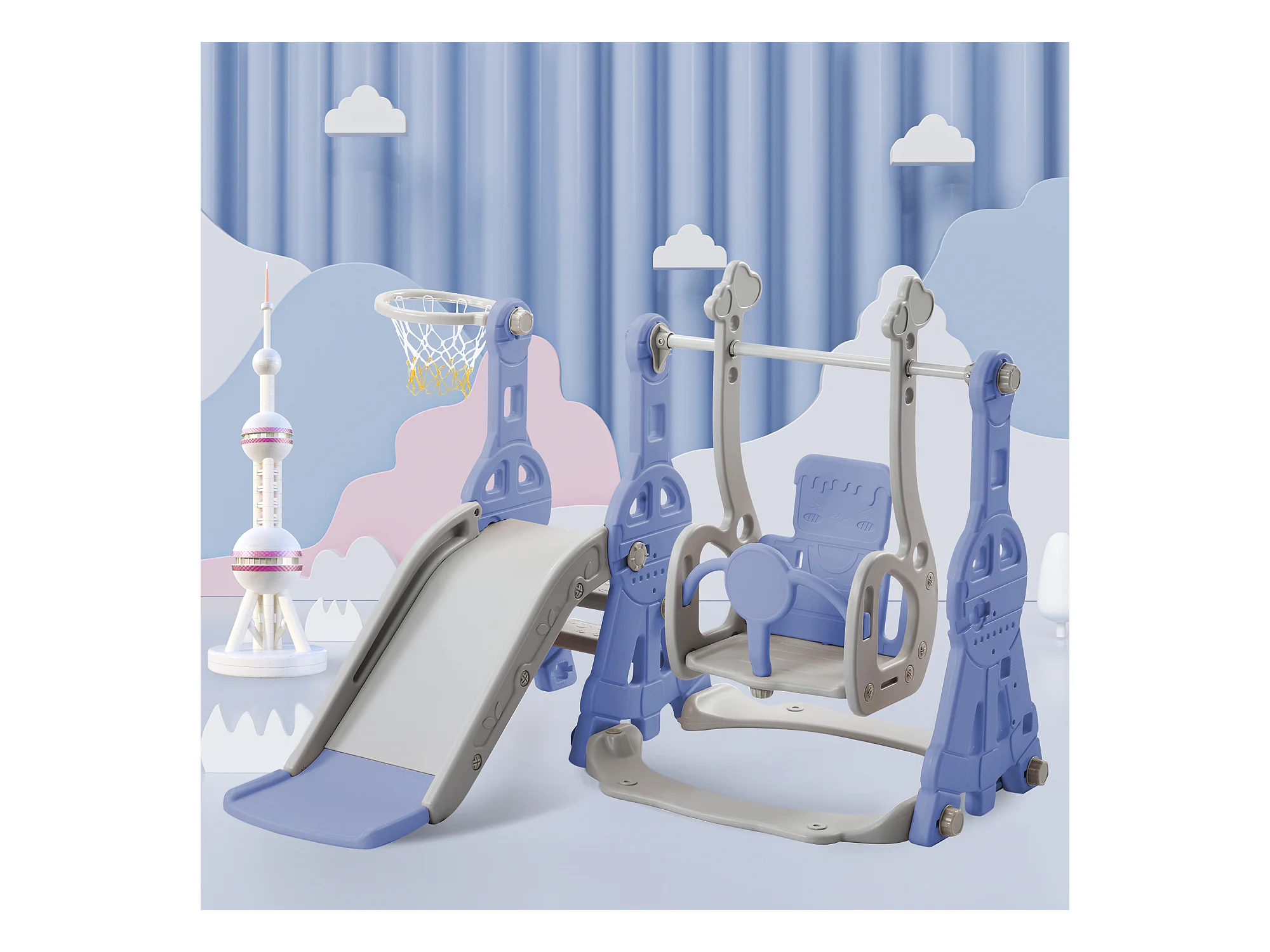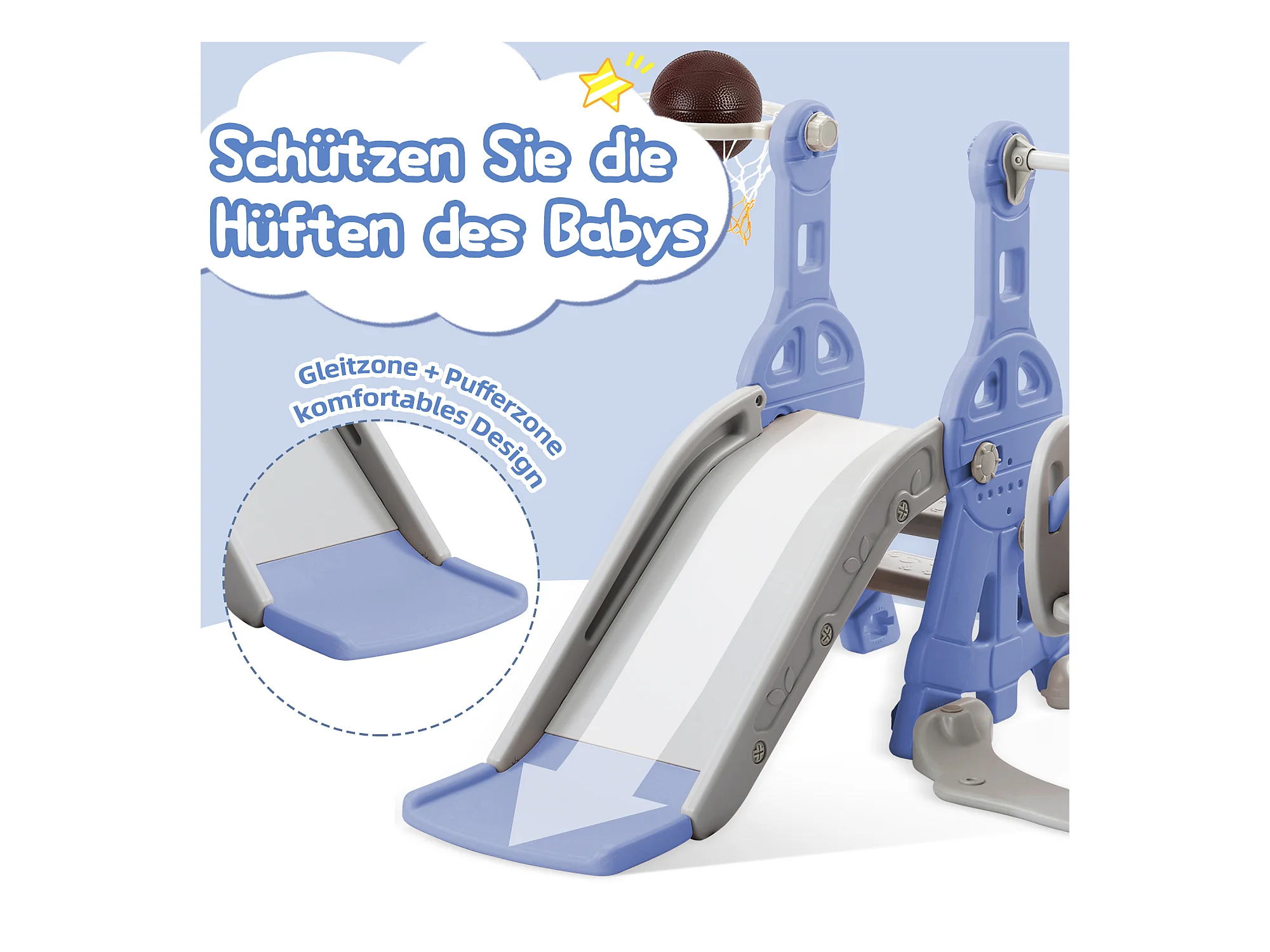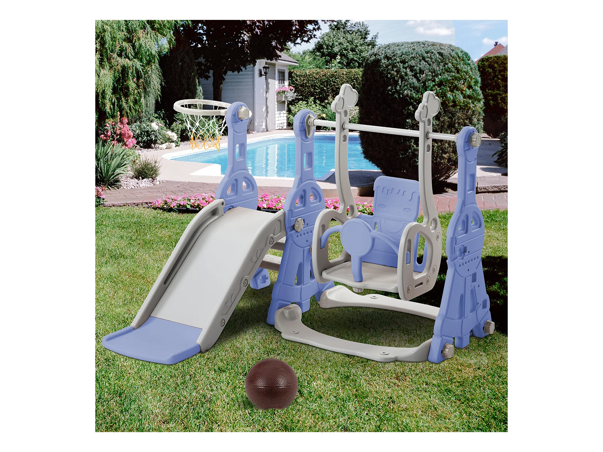 Toboggan 4 en 1 avec balançoire et support de basket-ball pour enfants, échelle d'escalade, pour intérieure et extérieure, bleu