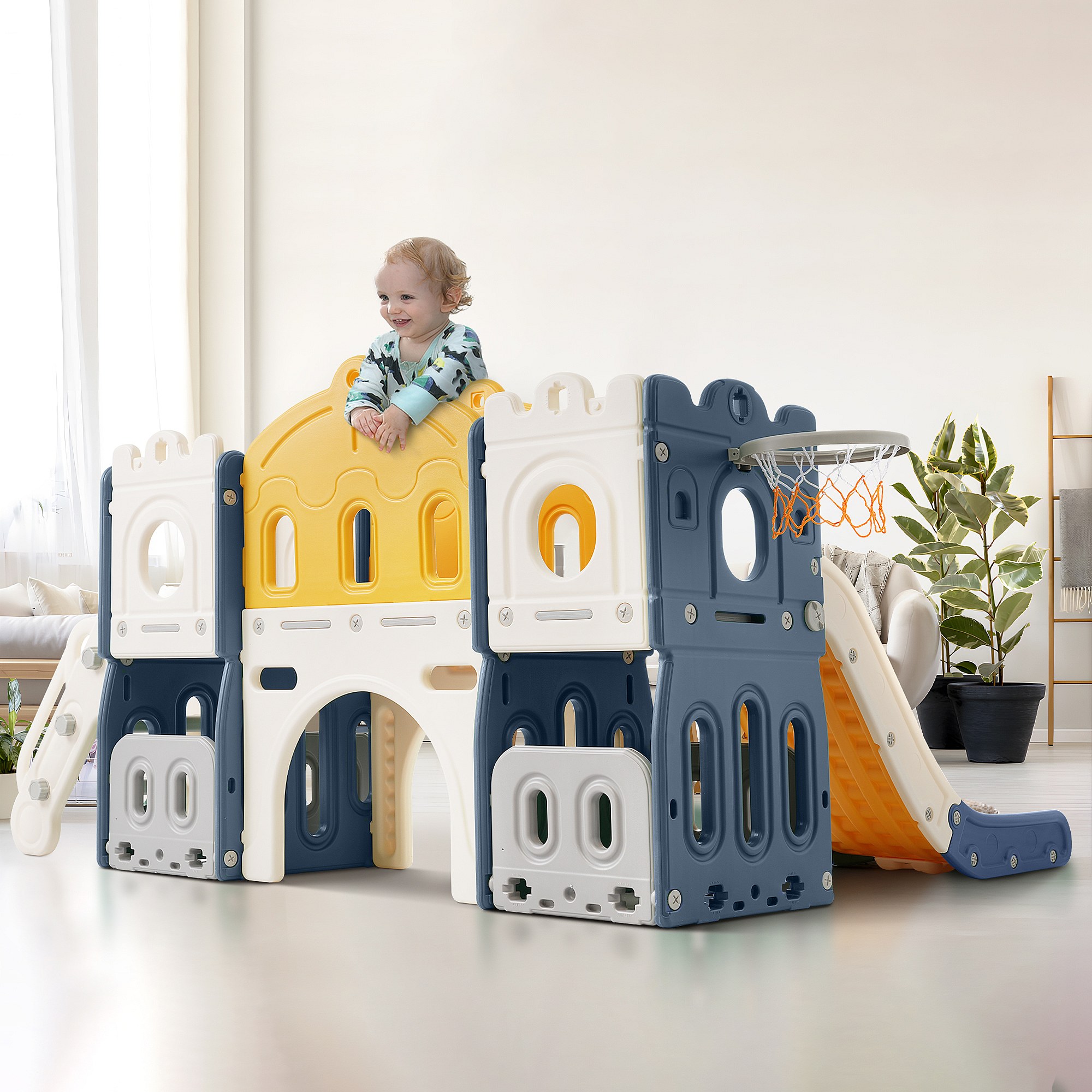 Toboggan château pour enfants 6 en 1 -190 x 151 x 106cm - en HDPF - avec escalade et panier de basket - Bleu