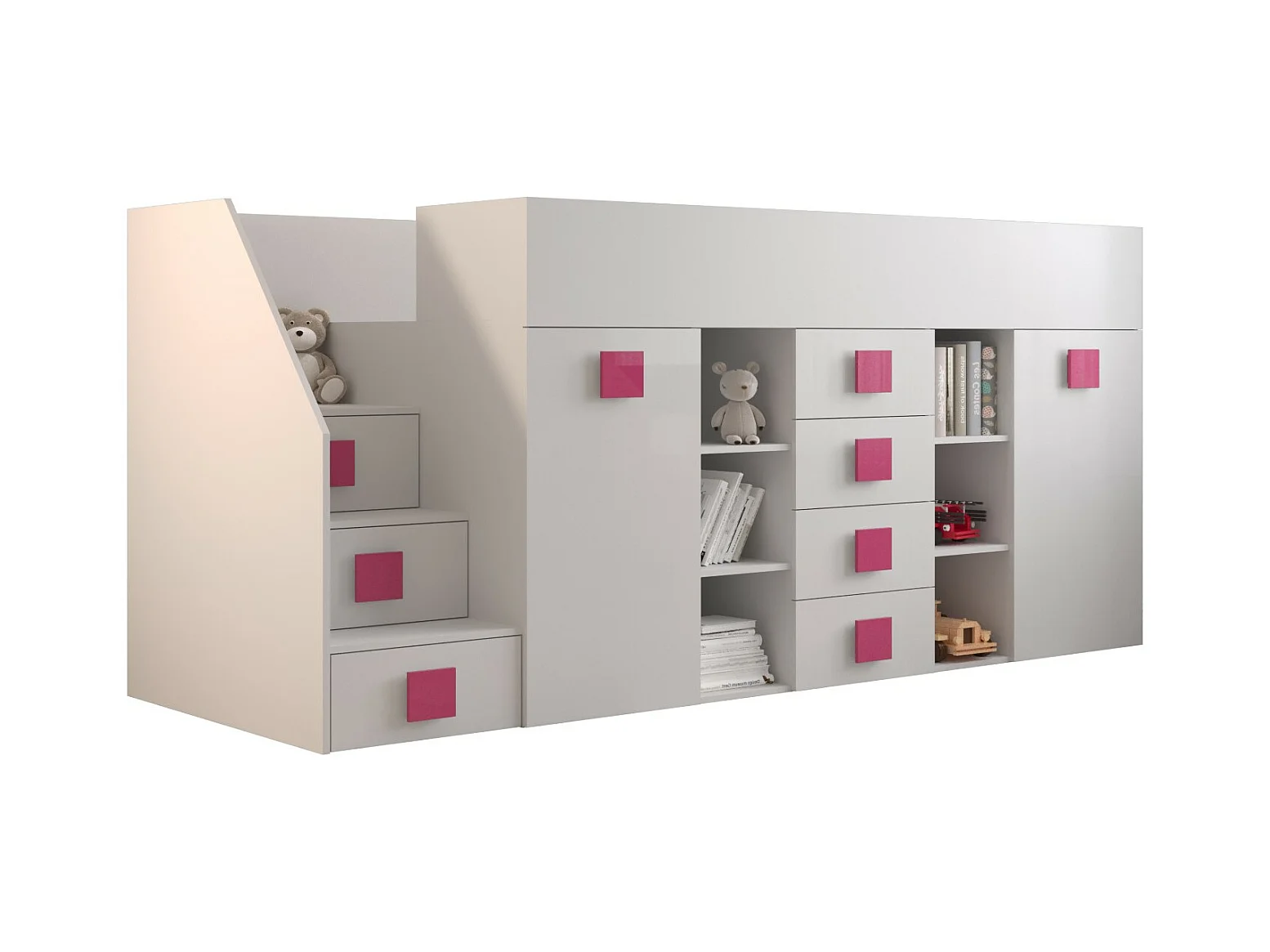 Lit superposé 3 niveaux avec 2 tiroirs de rangement rose et blanc 90x200 Kopa