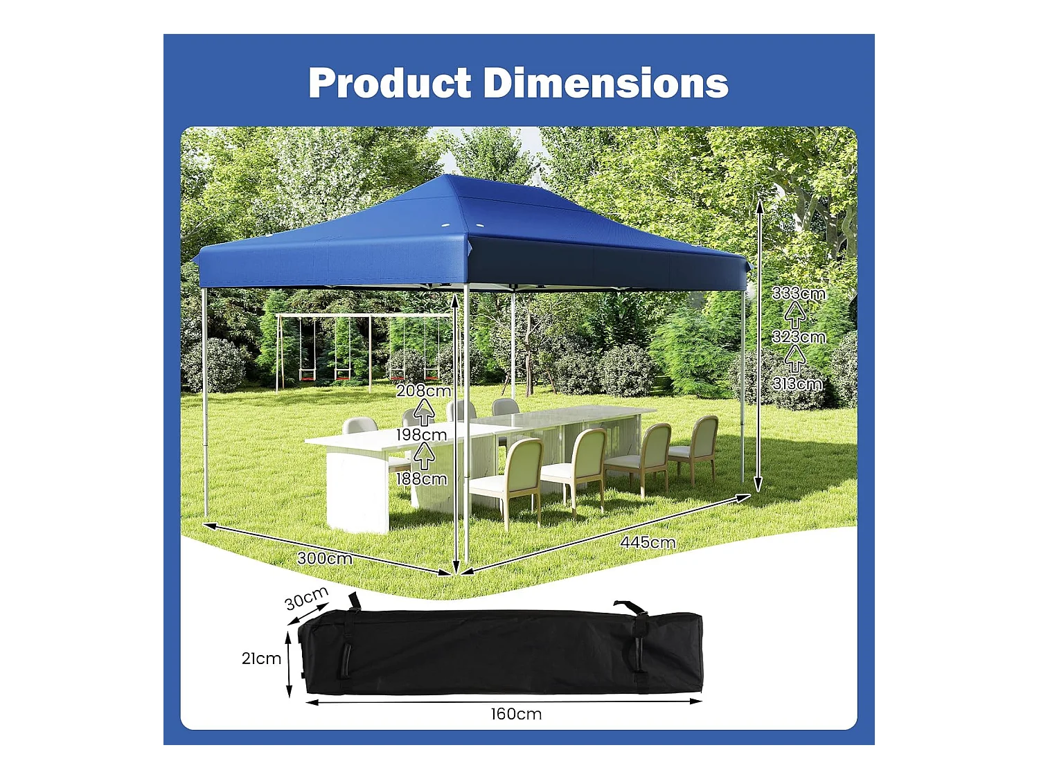 Tonnelle de Jardin Instantanée 300 x 445 CM, Tente de Jardin avec Trous de Drainage Sac à roulettes 4 Cordes, Abri Ajustable pour Marché Camping Mariage (Bleu)