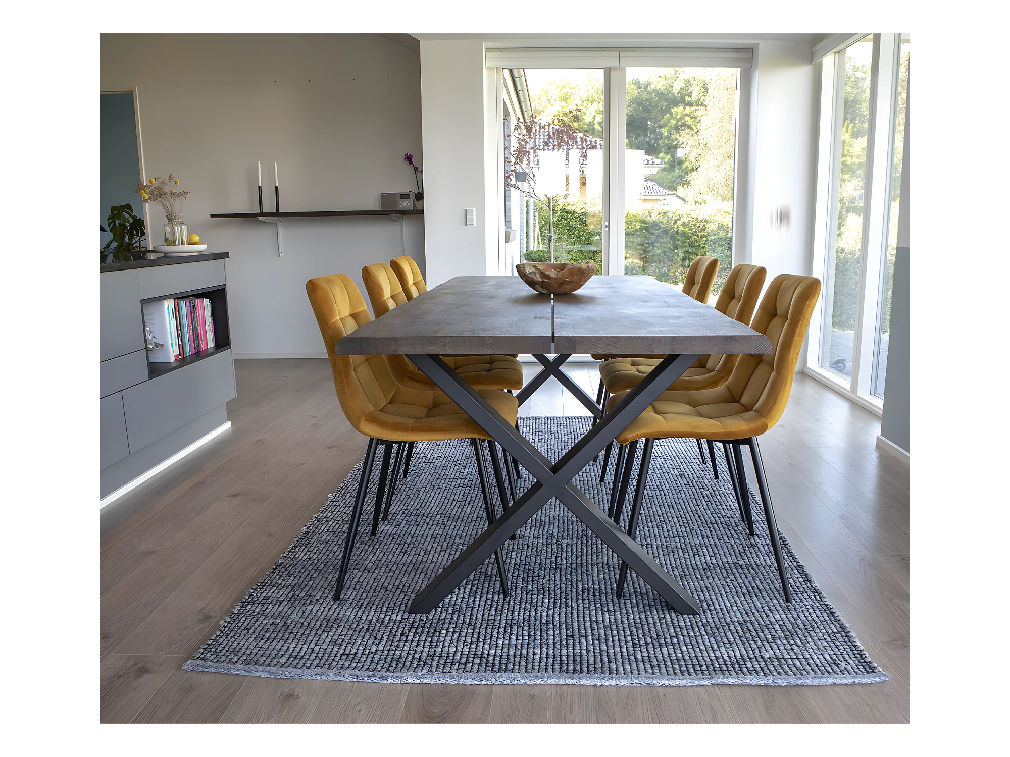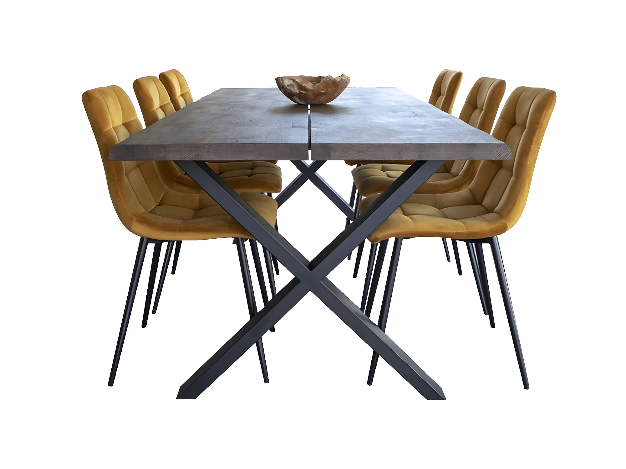 Tony Salle à manger, 1 table à manger et 6 chaises, jaune et chêne.
