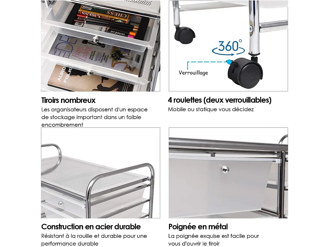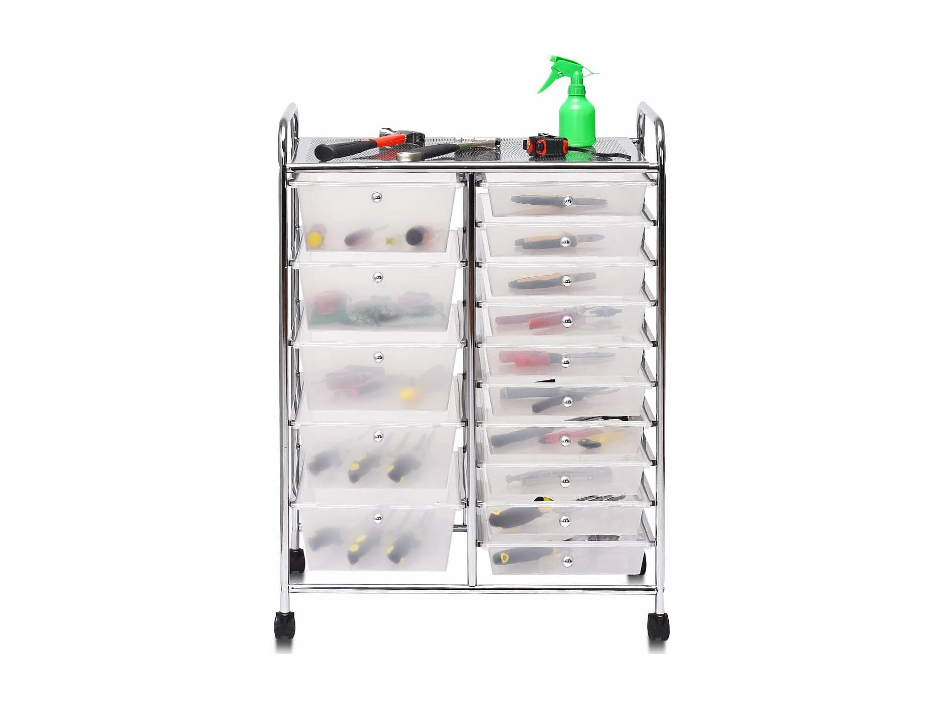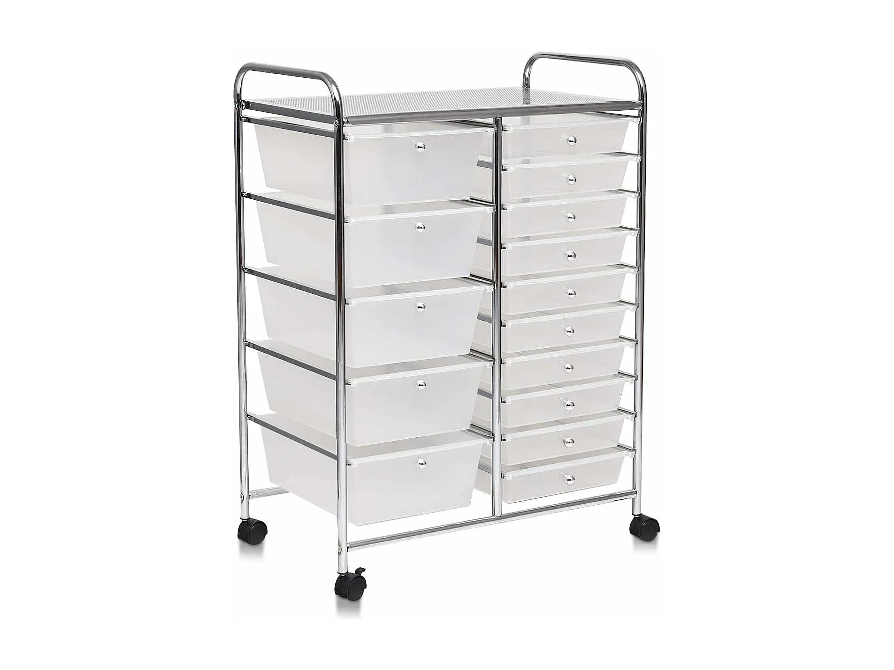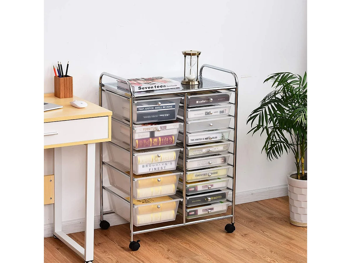 Chariot de Rangement 15 Tiroirs en PP, Tour de Rangement à Roulette, Cadre en Métal, Desserte Meuble Tiroir pour Cuisine, Salle de Bain, École (62,5 x 37 x 87 CM, Clair)