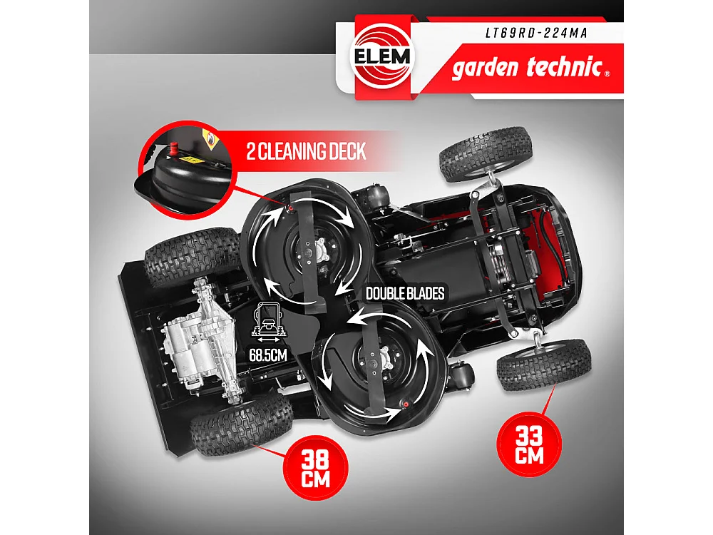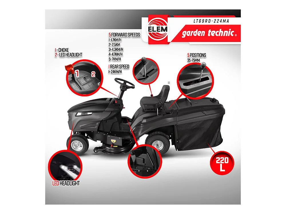 Tracteur tondeuse thermique 224cc Elem Garden Technic - Largeur de coupe 68,5 cm