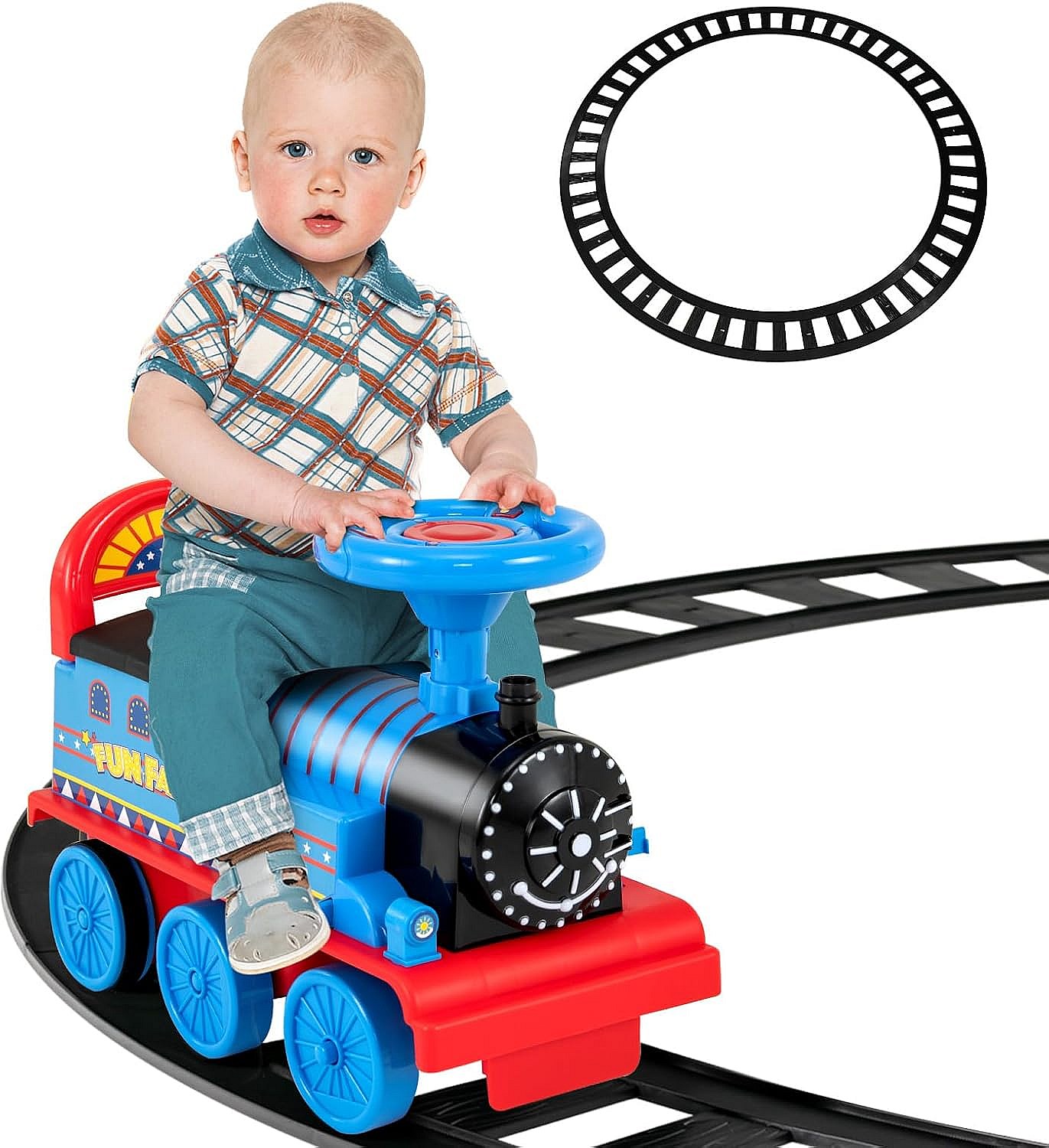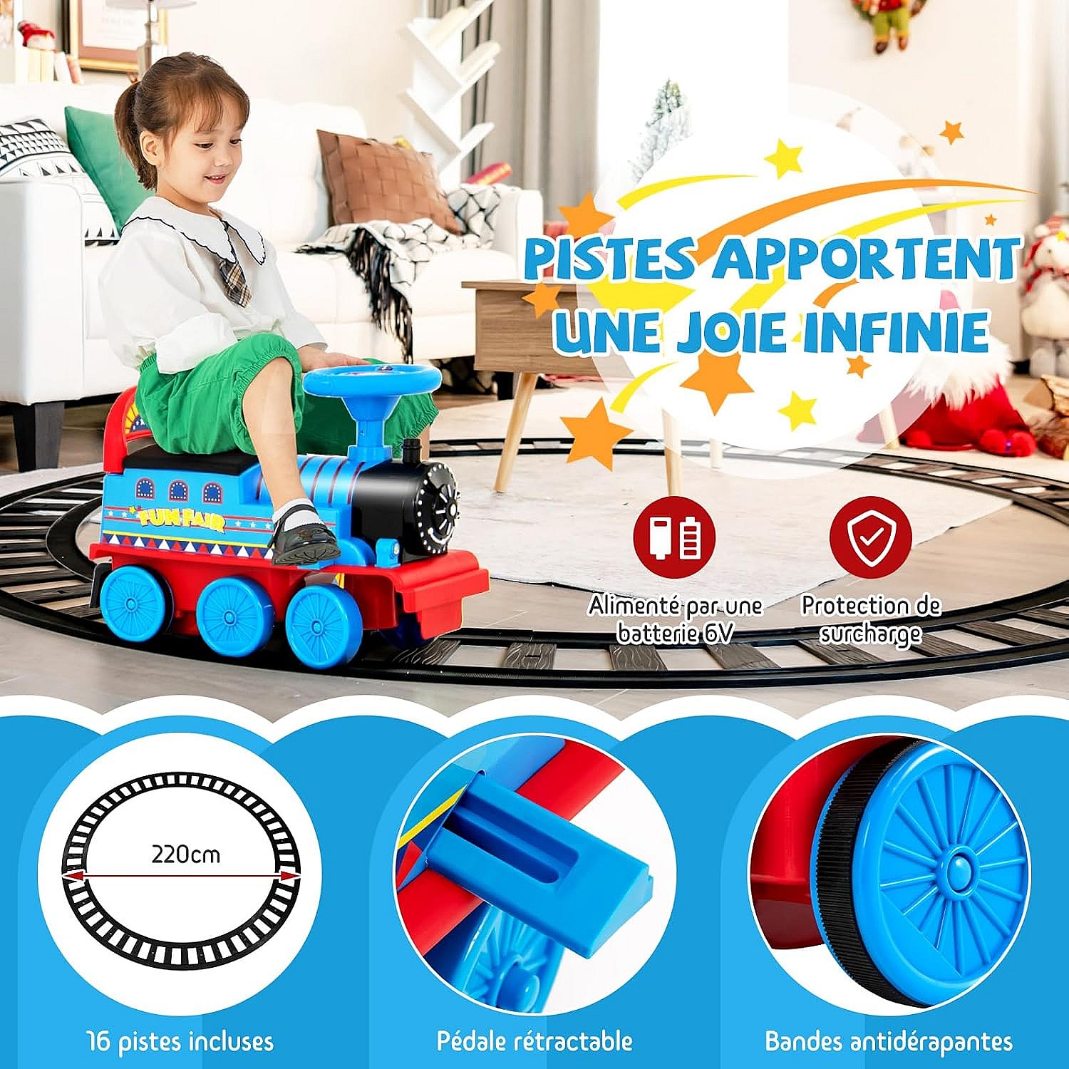 Train Porteur Electrique Enfants avec 16 Pièces de Rails, Voiture Porteur en Forme Lion avec Lumières & Sons, Charge 25kg pour Enfants de 3 Ans+