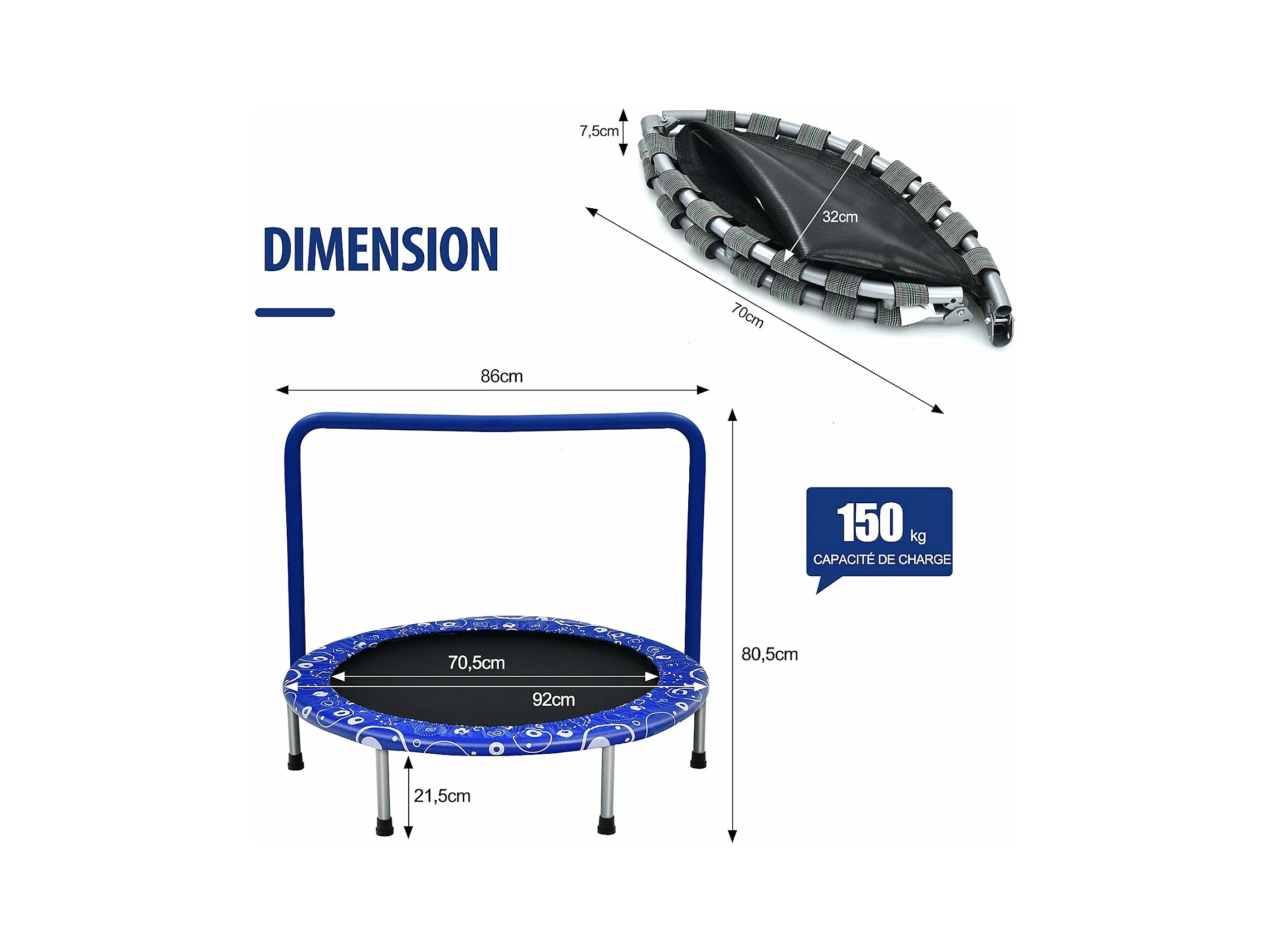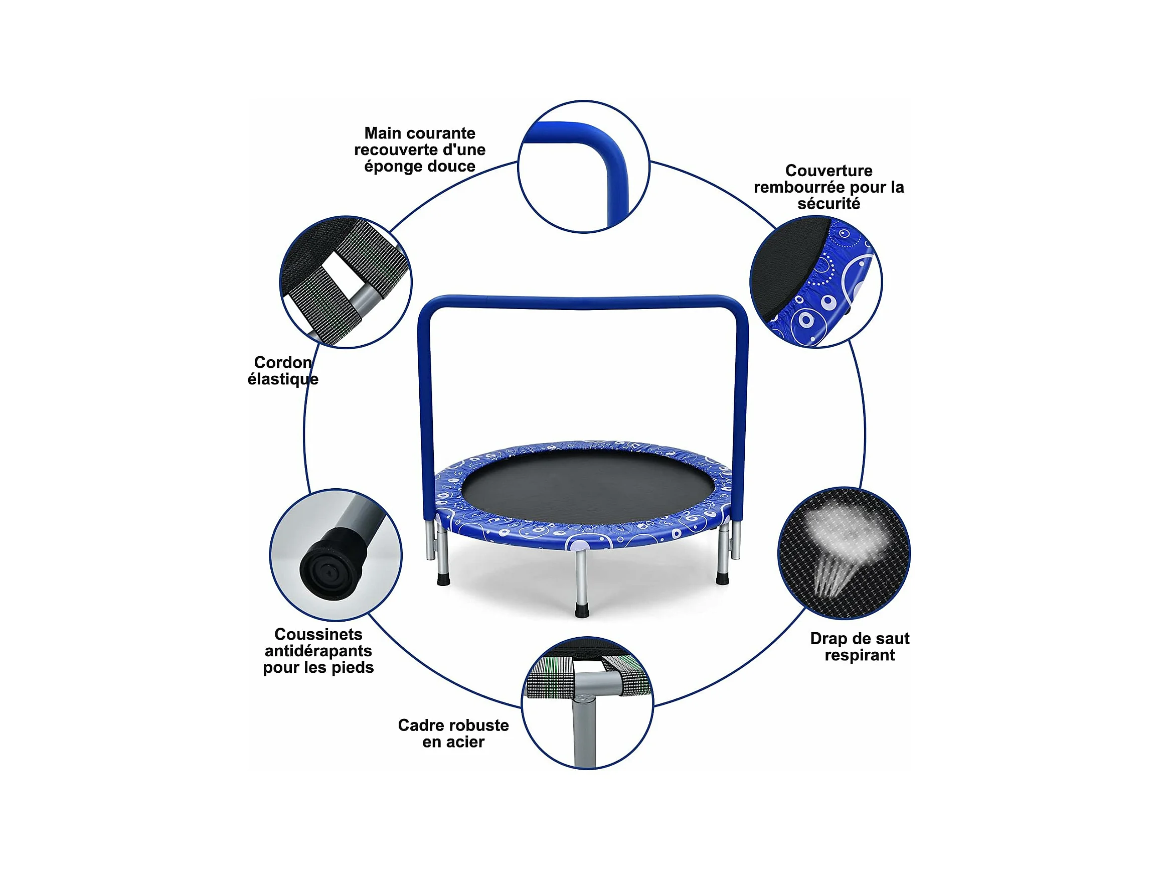 Trampoline Enfants Pliable Ø 92 cm avec Housse de Sécurité Matelassée et Poignée Recouverte Intérieur 150 KG Bleu
