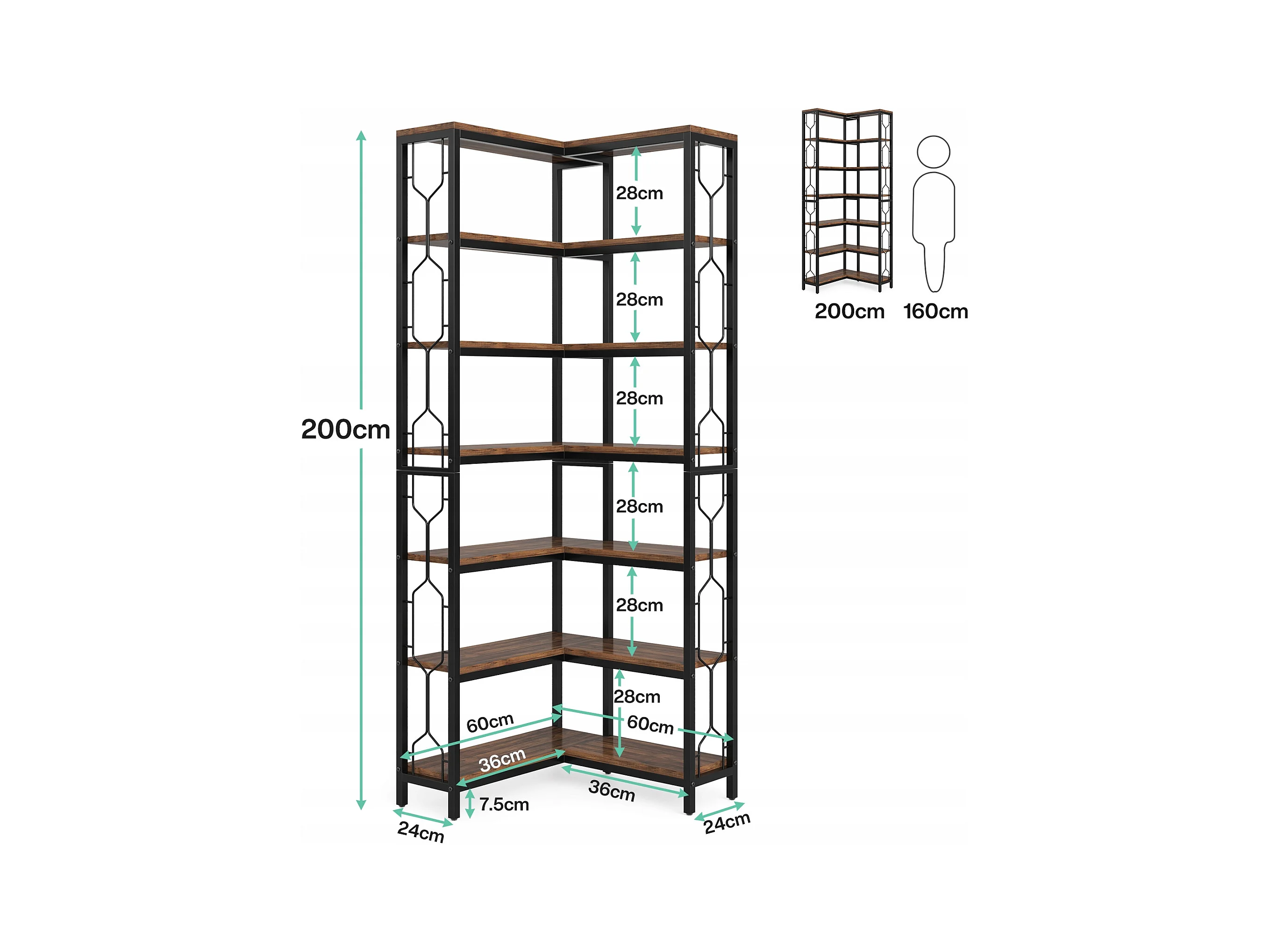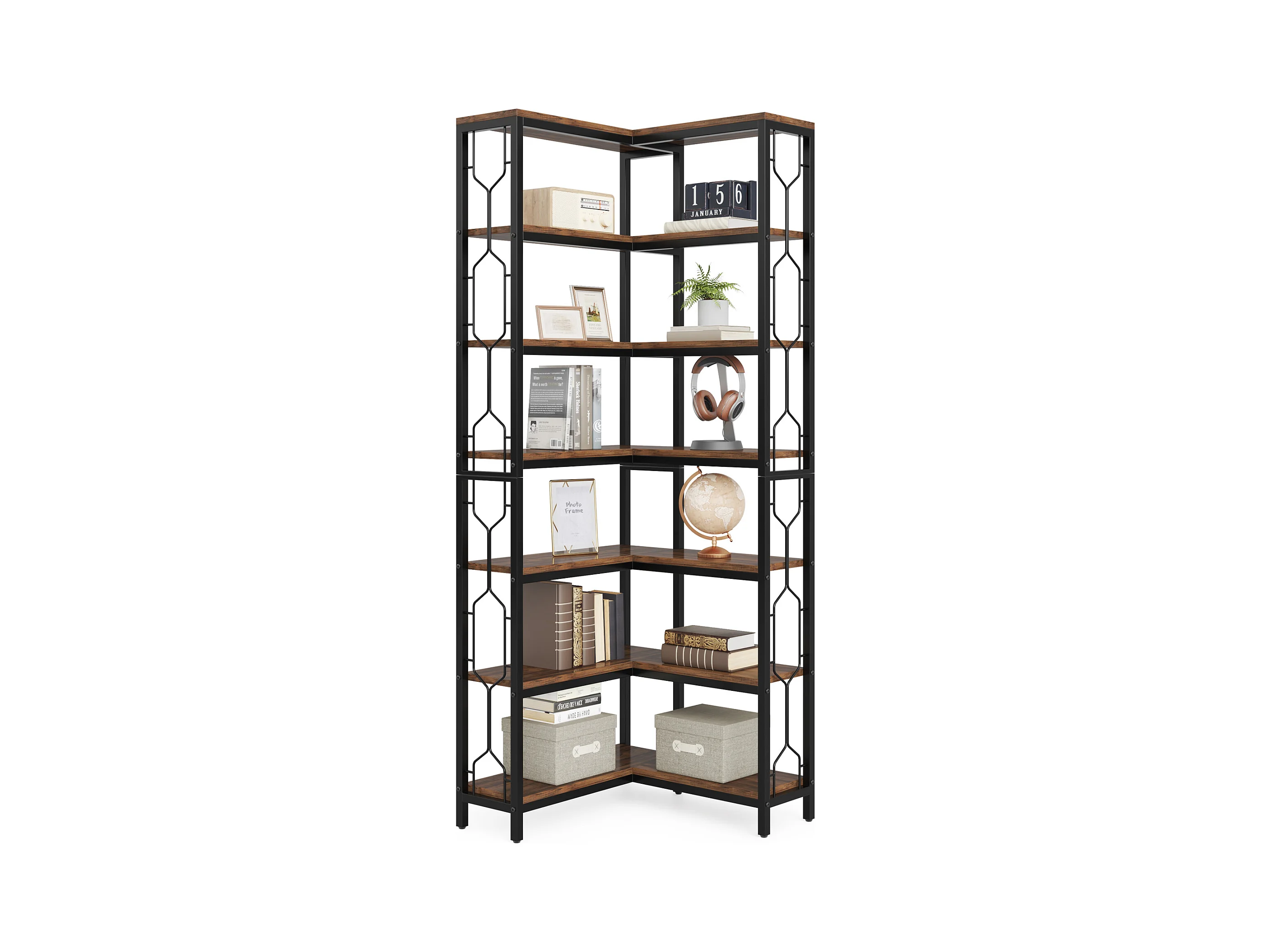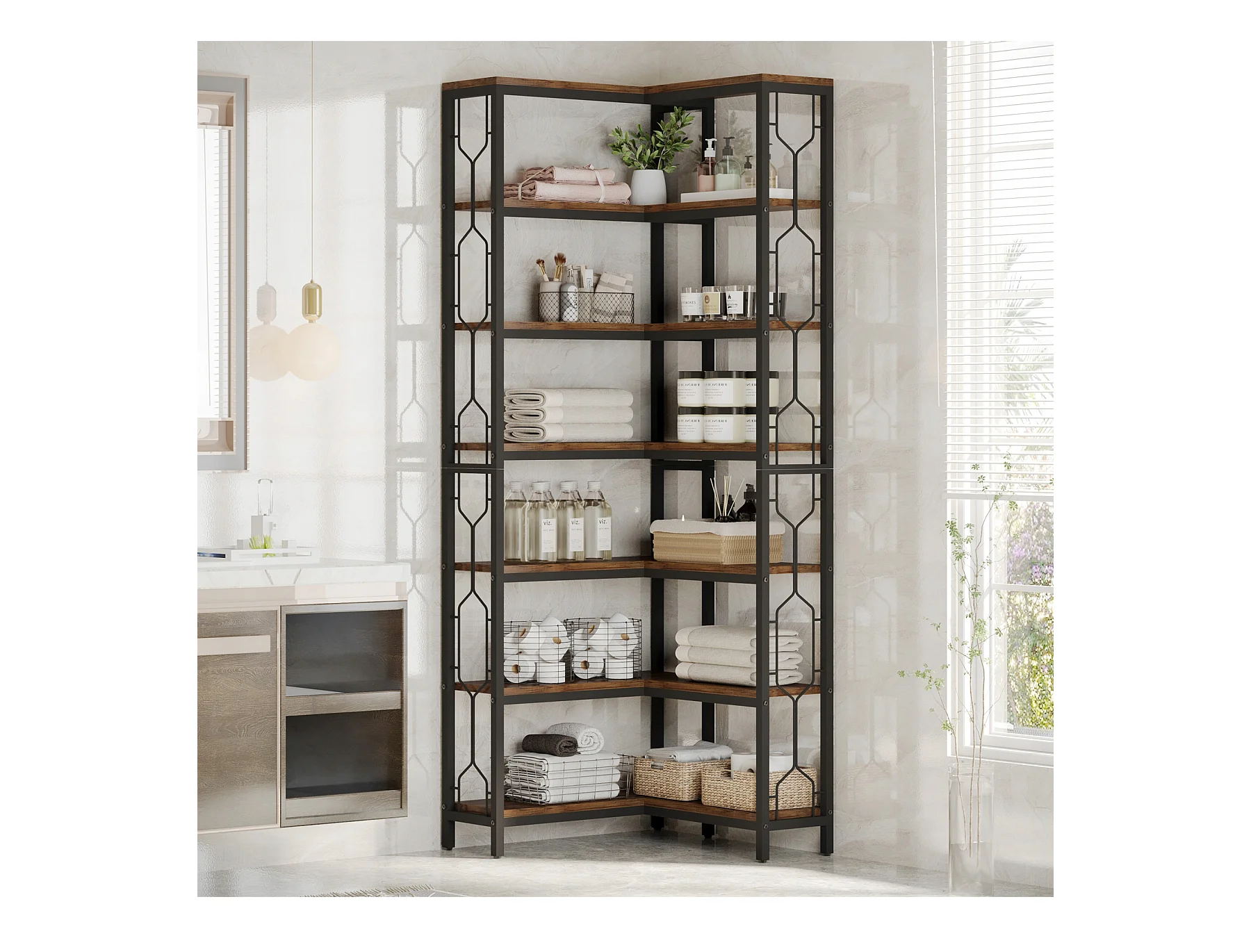 Bibliothèque d'angle, étagère Industrielle à 7 Niveaux, étagères d'angle en Bois et Métal, étagère d'affichage autoportante pour Le Salon