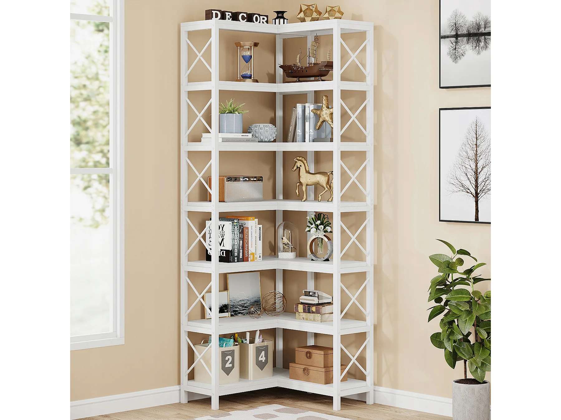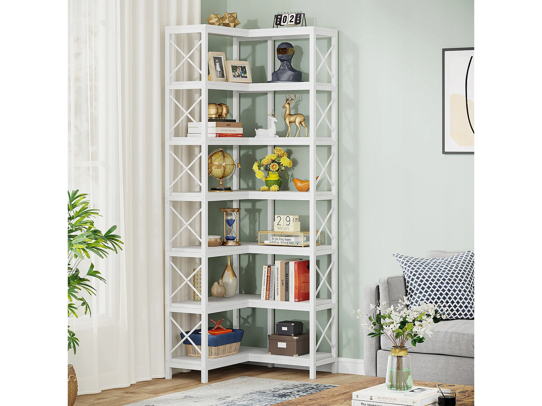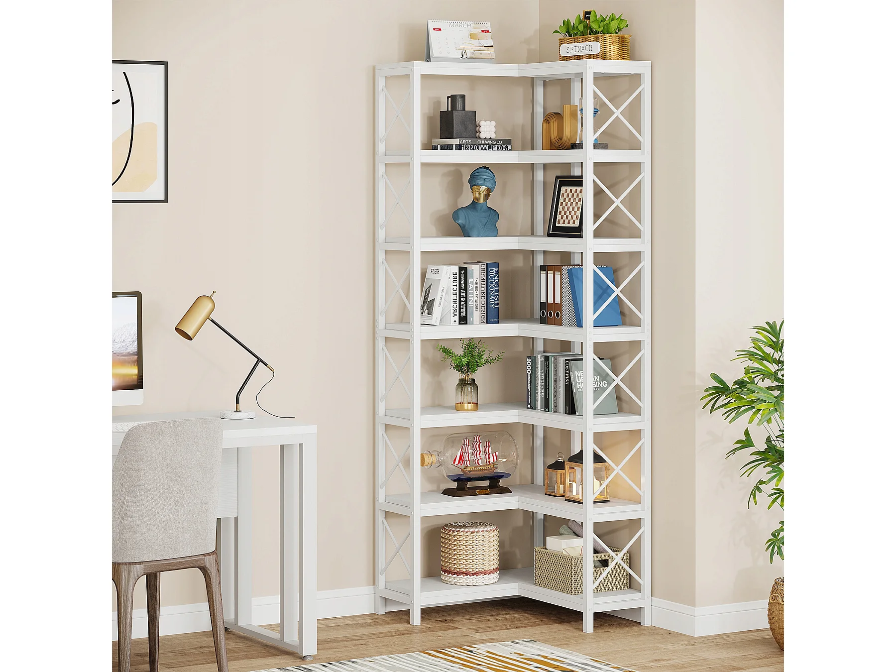 Grande bibliothèque d'angle moderne à 7 étagères avec cadre en métal pour salon, maison et bureau (blanc)