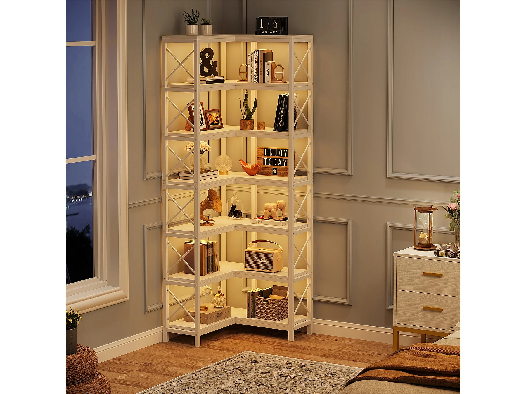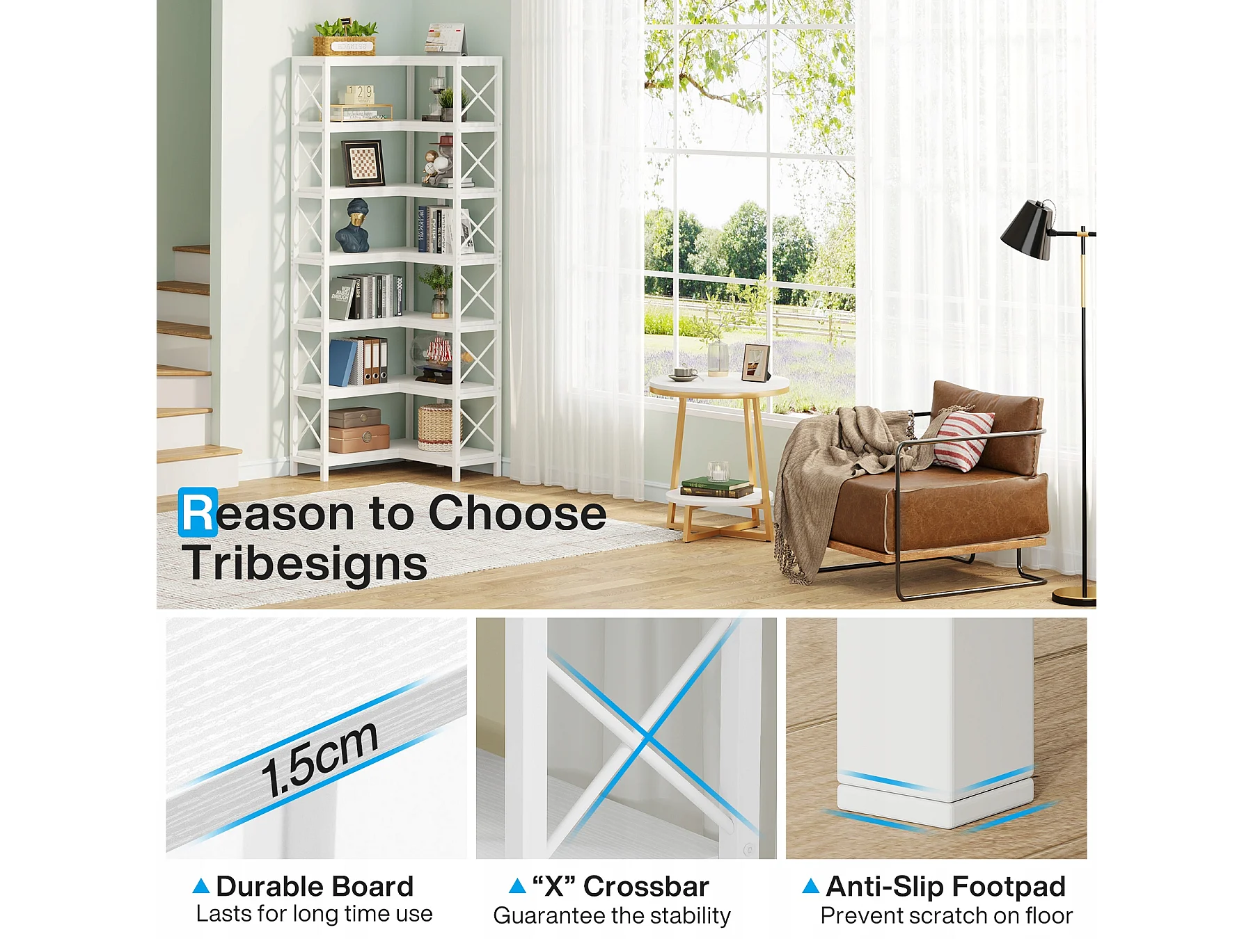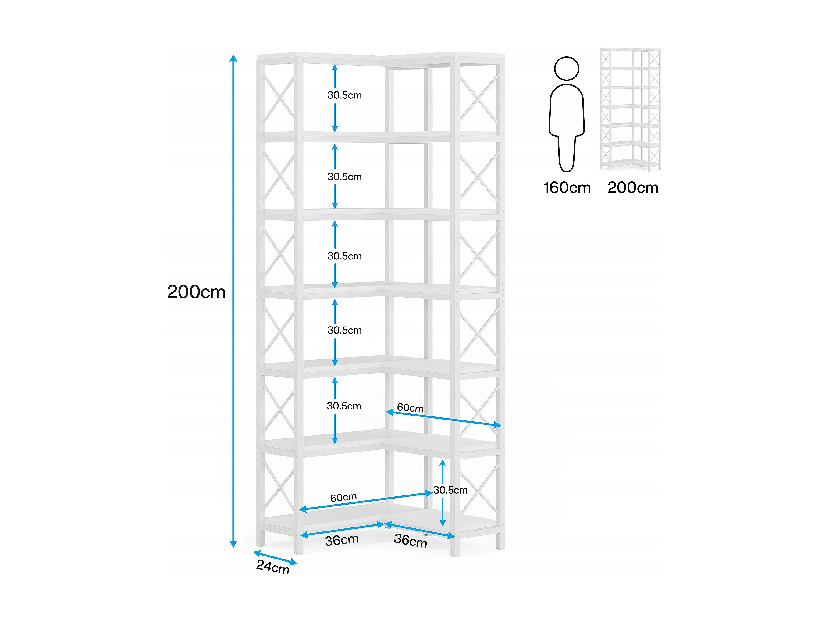 Grande bibliothèque d'angle moderne à 7 étagères avec cadre en métal pour salon, maison et bureau (blanc)