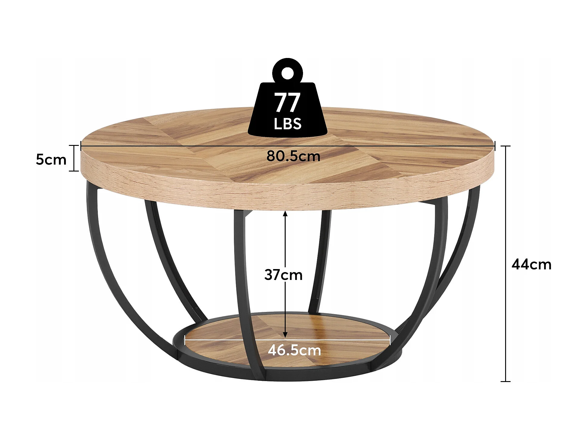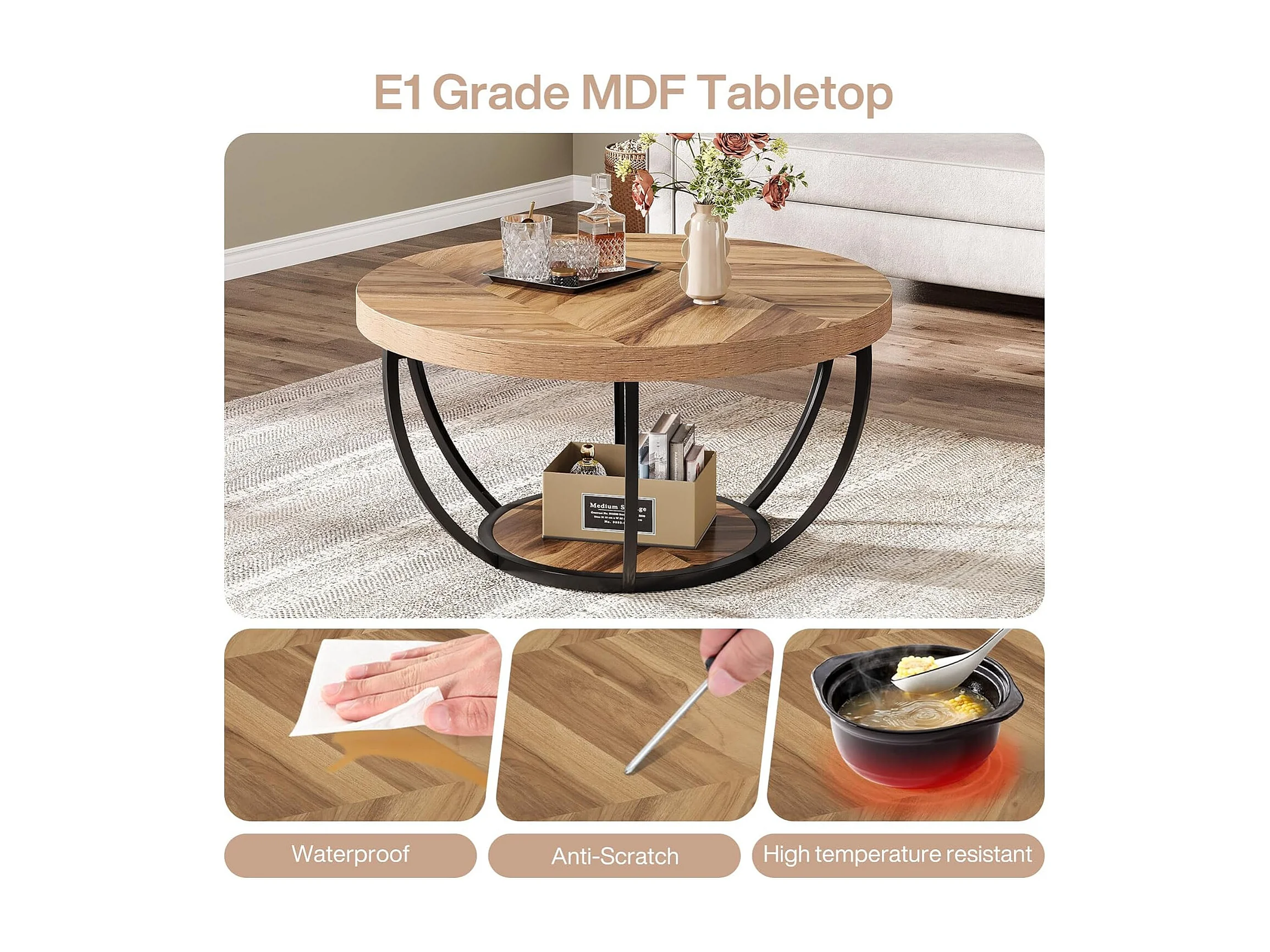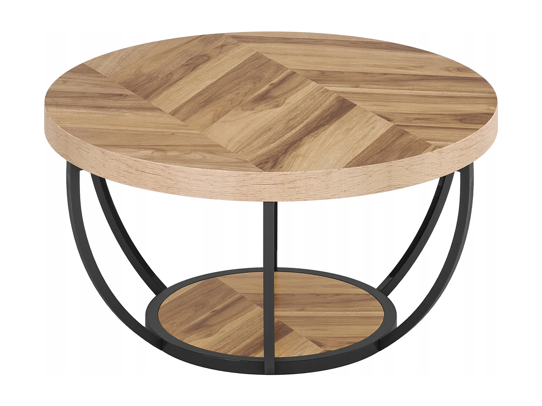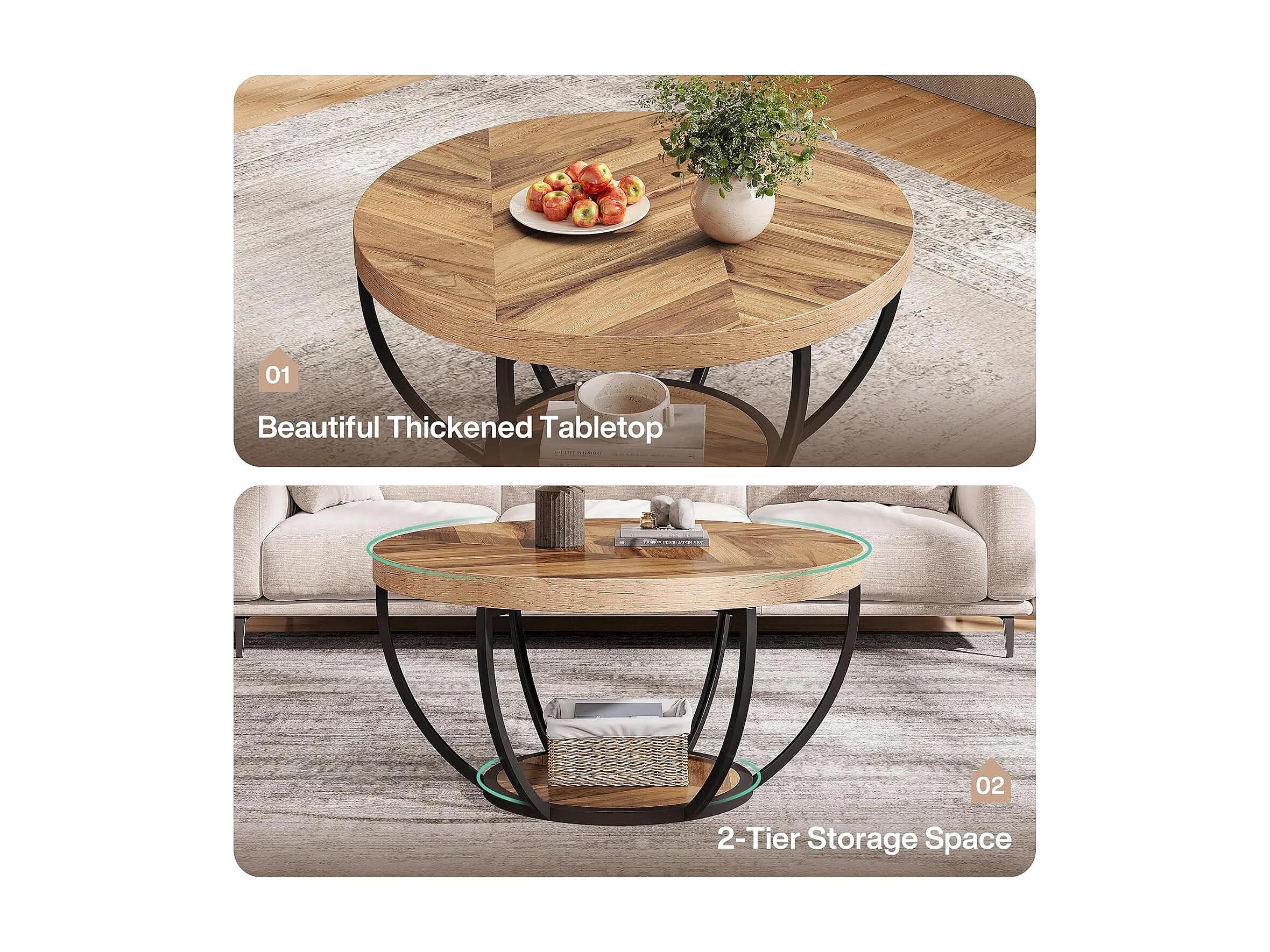 Table basse ronde de cocktail industrielle moderne à 2 niveaux avec étagères, table d'appoint de canapé circulaire avec pieds en métal