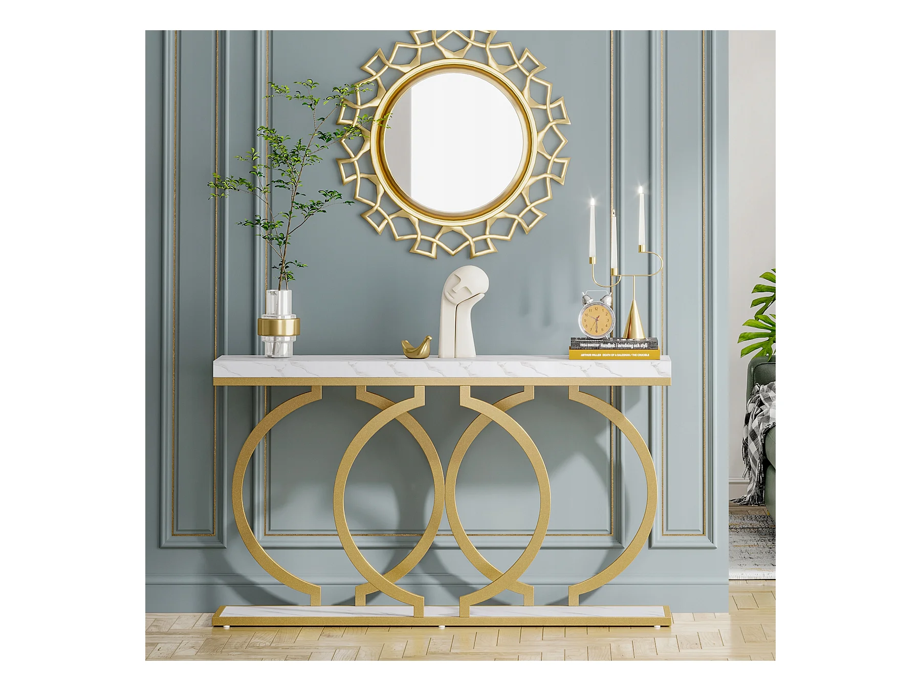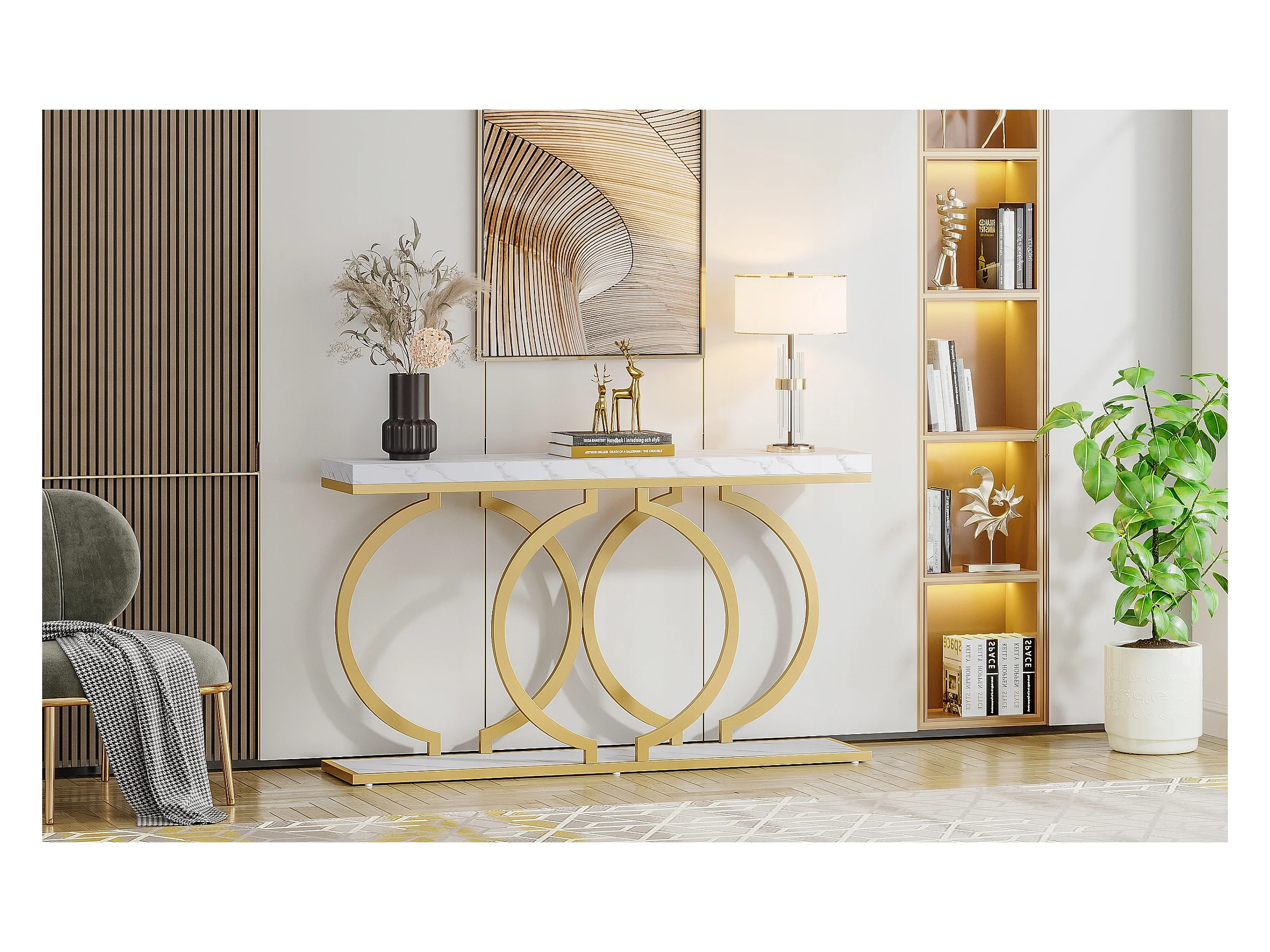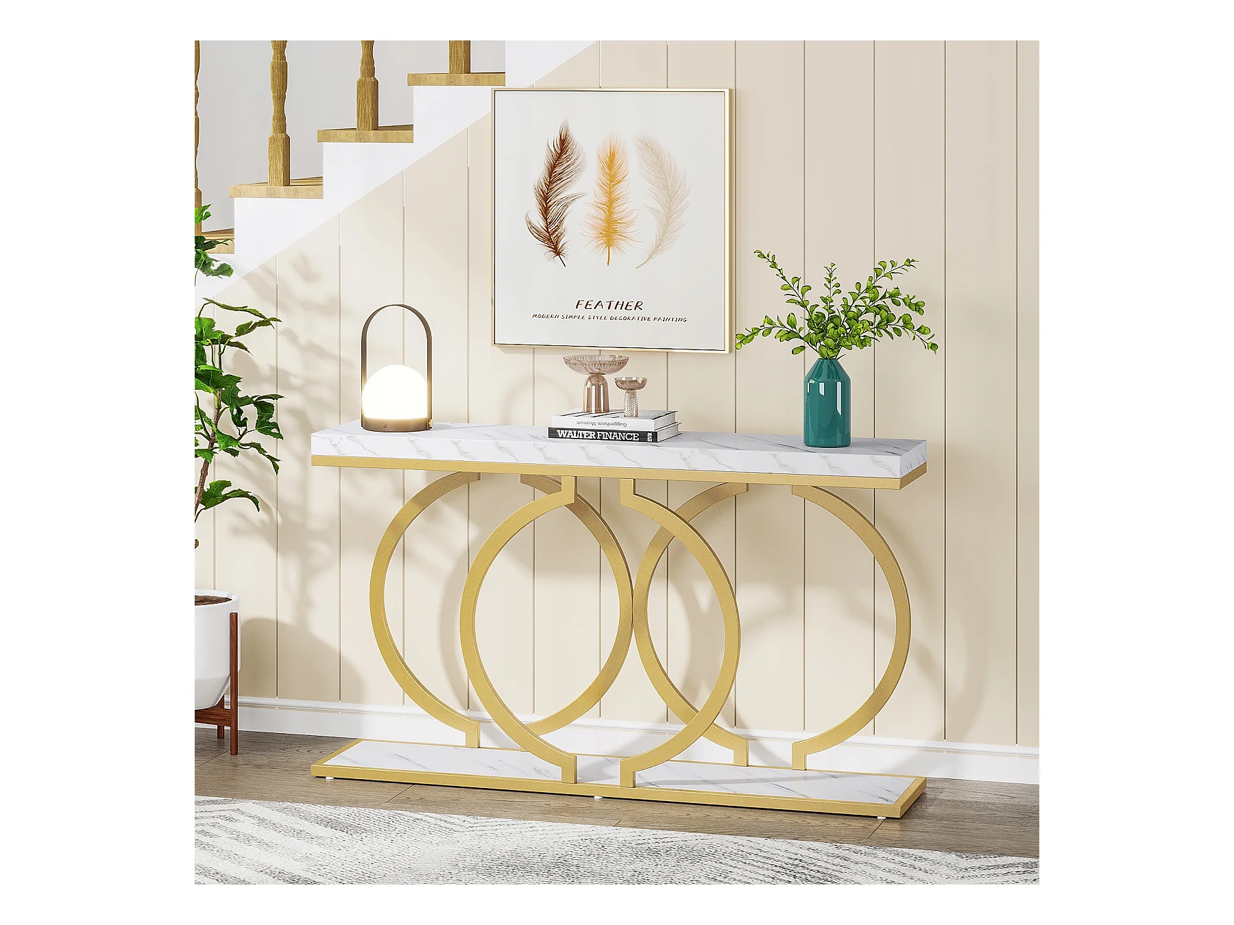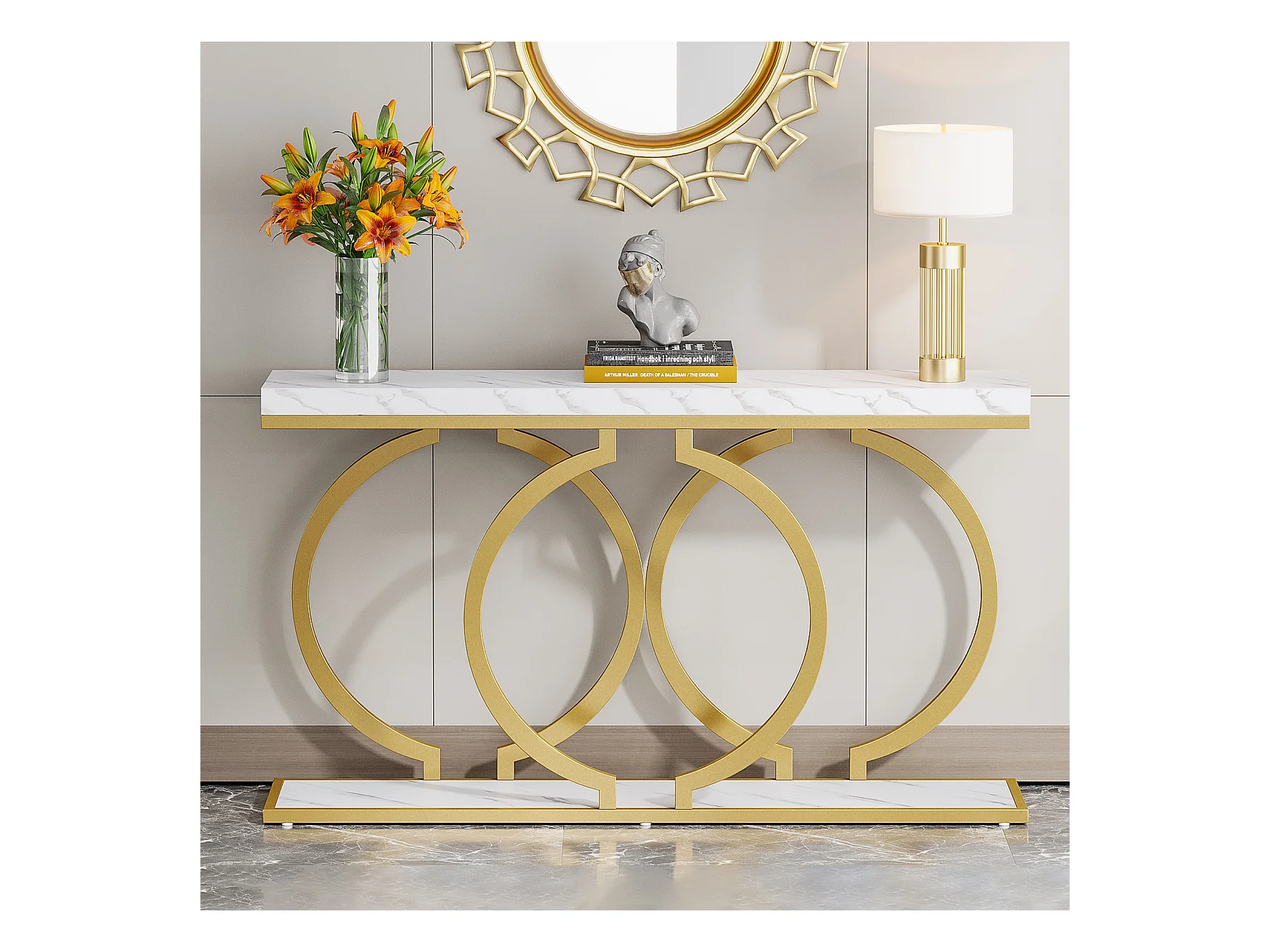 Table Console dorée de 140 cm, Table d'entrée Moderne avec Pieds en métal doré en Forme de O, Imitation marbre Blanc, Table d'entrée pour Salon